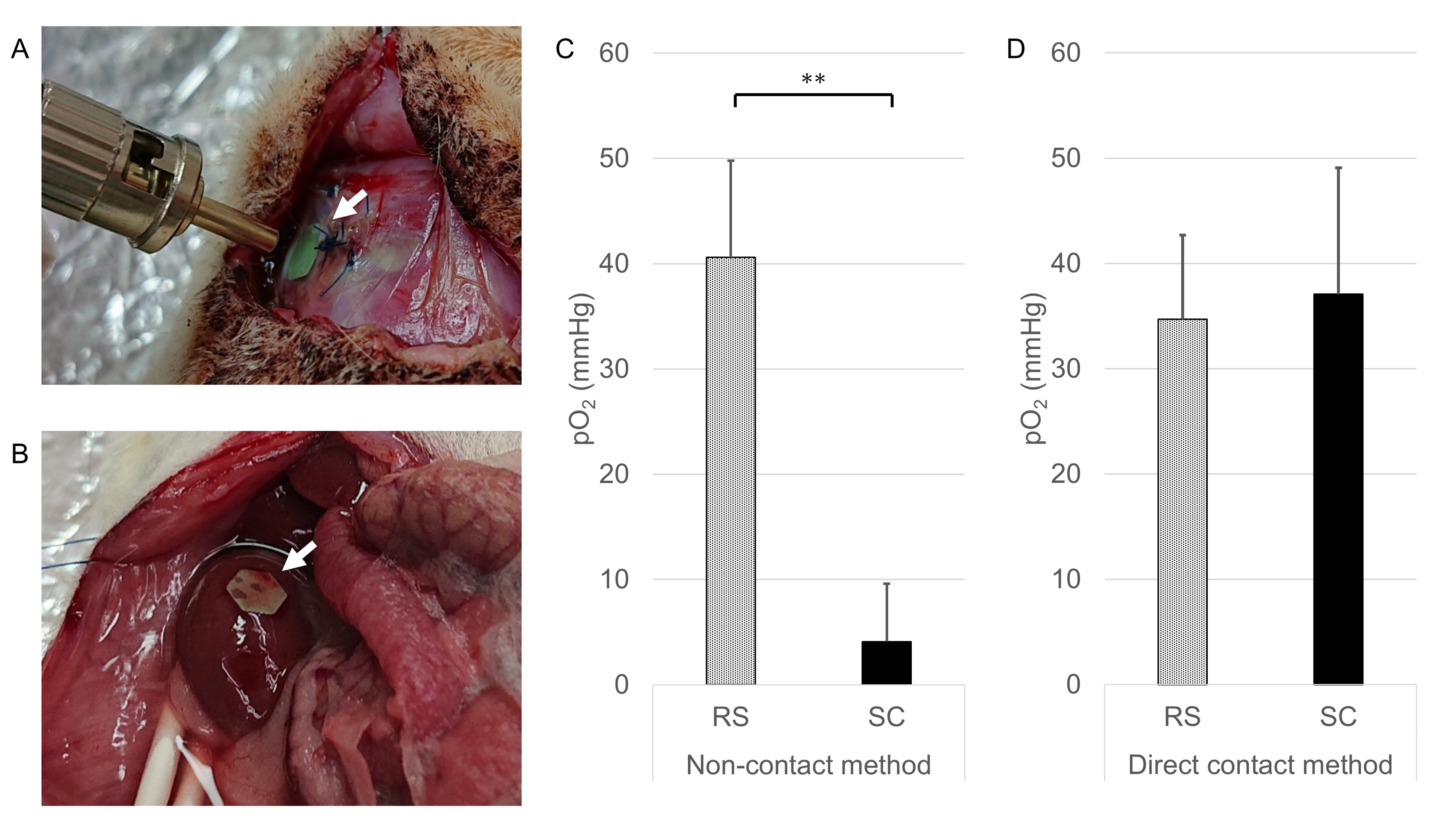 Introduction: Subcutaneous tissue is a promising site for islet transplantation, but poor engraftment, due to hypoxia and low vascularity, hinders its prevalence. However, oxygen partial pressure (pO2) of the subcutaneous space (SC) and other sites like the renal subcapsular space (RS) were reported to be equivalent in several previous reports. This contradiction may be based on accidental puncture to the indwelling micro-vessels in target tissues. We therefore developed a novel optical sensor system for measuring tissue pO2 and estimated the utility of this method.