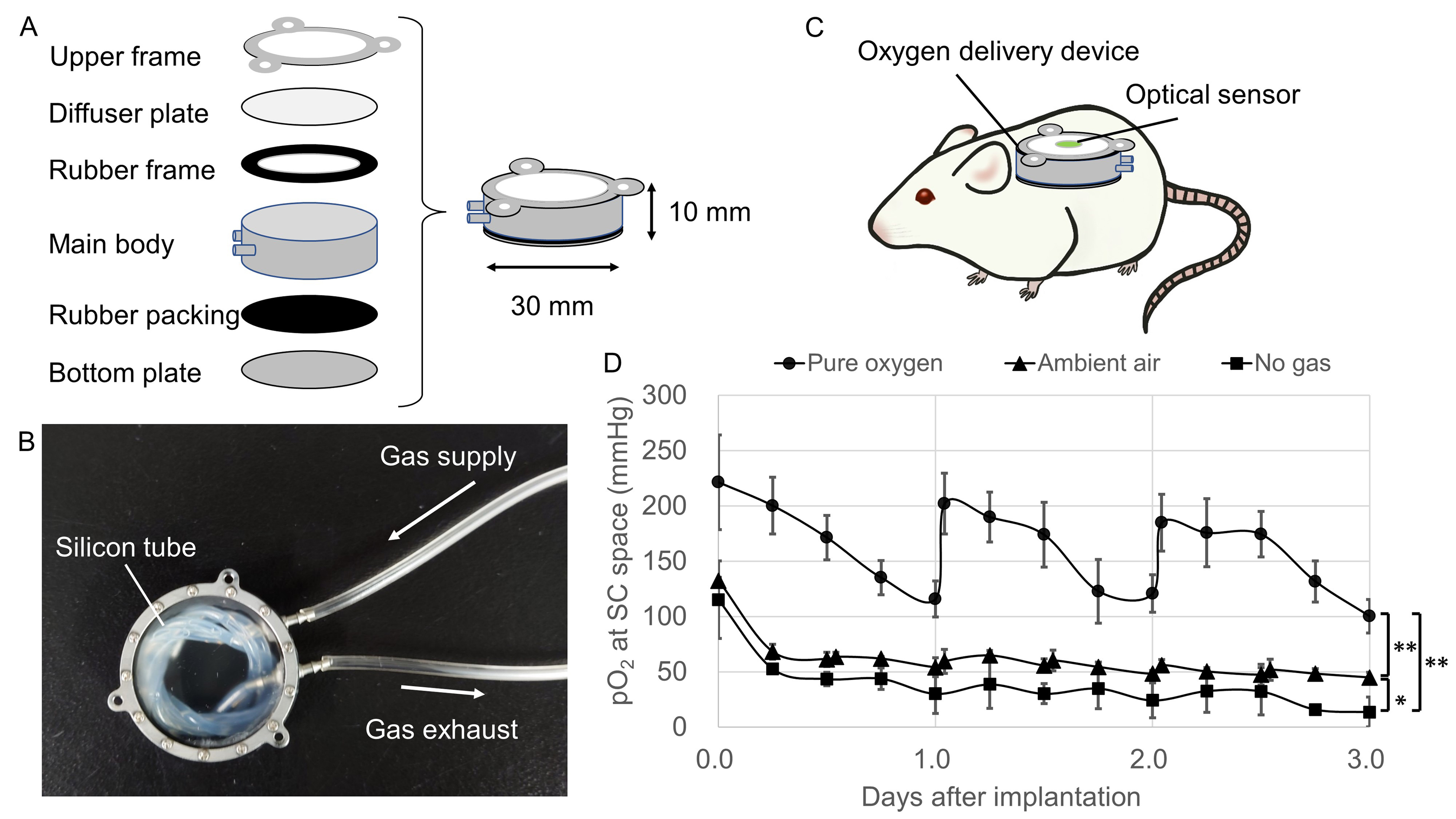 Method: An optical oxygen sensor was implanted into the SC (Fig.1A) and RS (Fig.1B) of rats. The pO2 values were measured by non-contact method using a contactless optical fiber at each site and compared to the values by direct contact method using a puncture-type optical oxygen sensor. We developed the oxygen delivery device and implanted it into rats subcutaneously to increase the pO2 of the SC (Fig.2A-C). Pure oxygen, Ambient air and No gas groups were made by the difference of oxygenation conditions of the oxygen delivery device. To verify the utility of this method, we transplanted syngeneic rat islets subcutaneously into diabetic recipients under several oxygenation conditions using the oxygen delivery device, then estimated the graft function by glucose tolerance test, and the graft viability by measuring the insulin extraction and the ATP/DNA ratio.