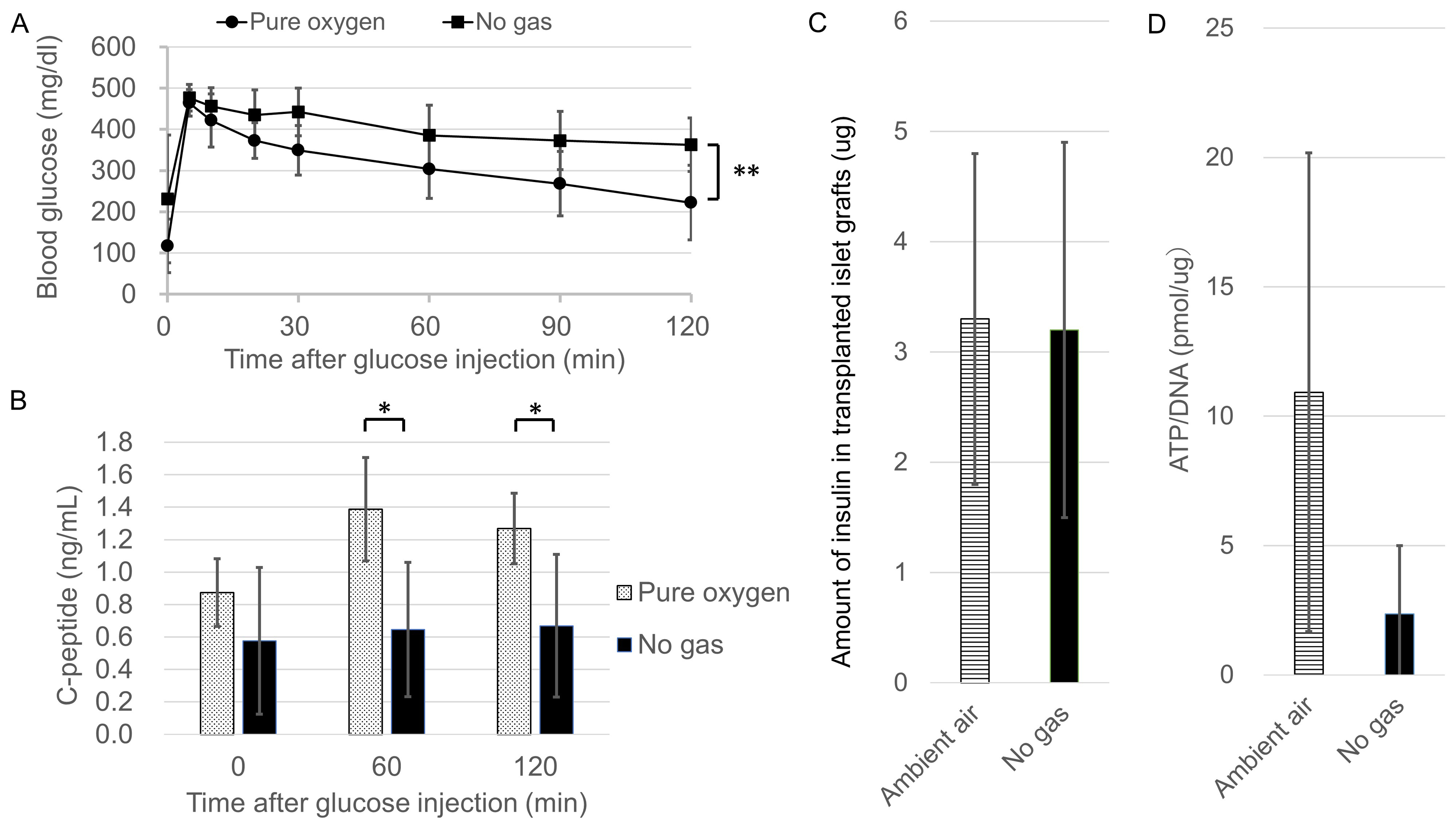 Results: In the non-contact method, the pO2 of the SC was significantly lower than that of the RS (Fig.1C, p<0.01). In contrast, no difference was observed in the direct contact method (Fig.1D, p=0.62). The pO2 of the SC was significantly increased in the Pure oxygen and the Ambient air groups compared to the No gas group (Fig.2D). In the Pure oxygen group, the glucose tolerance of the transplanted recipients was better (Fig.3A, p<0.01) and the serum C-peptide levels increased significantly (Fig.3B, p<0.05) in comparison to the No gas group, suggesting that superior functional engraftment of the islet grafts was seen in the Pure oxygen group. In terms of the amount of insulin in the islet grafts, there was no significant difference between the Ambient air and No gas groups (Fig.3C, p=0.81). However, the ATP/DNA of islet grafts in the Ambient air group tended to be higher than that in the No gas group (Fig.3D, p=0.07)