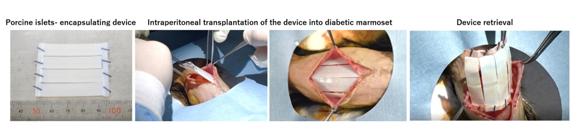 Introduction: Islet transplantation is an effective treatment for type 1 diabetes (T1D), but donor shortages and the need for immunosuppressants are major challenges. Porcine islets are a promising cell resource for diabetes treatment. However, delivery of these islets, control of the xenogeneic immune response, maintenance, and retrieval of transplanted islets remain a challenge. We have previously developed a novel device with immune-isolation ability for xenotransplantation, and have published that the device encapsulating porcine islets can improve glycemic control for more than 200 days without immunosuppressive drugs when transplanted in immunocompetent diabetic mice (2022 Cell Rep. Methods. K. Ajima et al.) We then systematically evaluated this xenotransplantation device in larger animal models than mice: nonhuman primates.