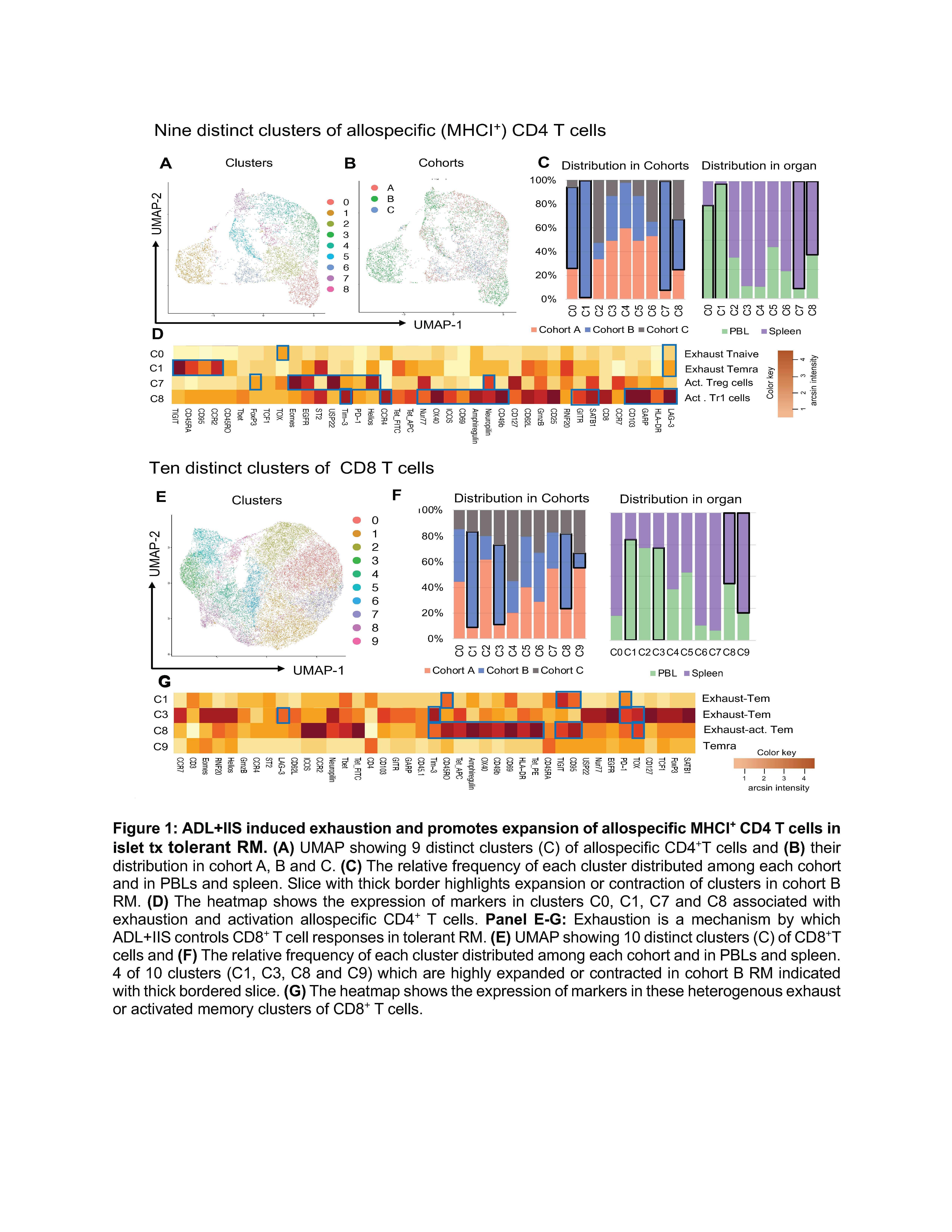 Methods: We employed a 45-parameter CyTOF panel, which spans cell surface and intracellular antigen, validated for use in nonhuman primates, to analyze the identity, abundance, and phenotypic profile of circulatory and splenic T cell subsets in rhesus macaques undergoing islet transplantation by cohort: A (1 DRB-matched with IIS only), B (1 DRB-matched with ADLs+IIS), and C (complete MHC mismatch with ADLs+IIS), each with an n=3. To track allospecific CD4+ T cells, we incorporated MHC class II tetramers that were loaded with mismatched donor MHC class I peptides into the CyTOF panel. The bioinformatics analysis was by unsupervised UMAP clustering to investigate the heterogeneity and functional profiles of T cell subsets.