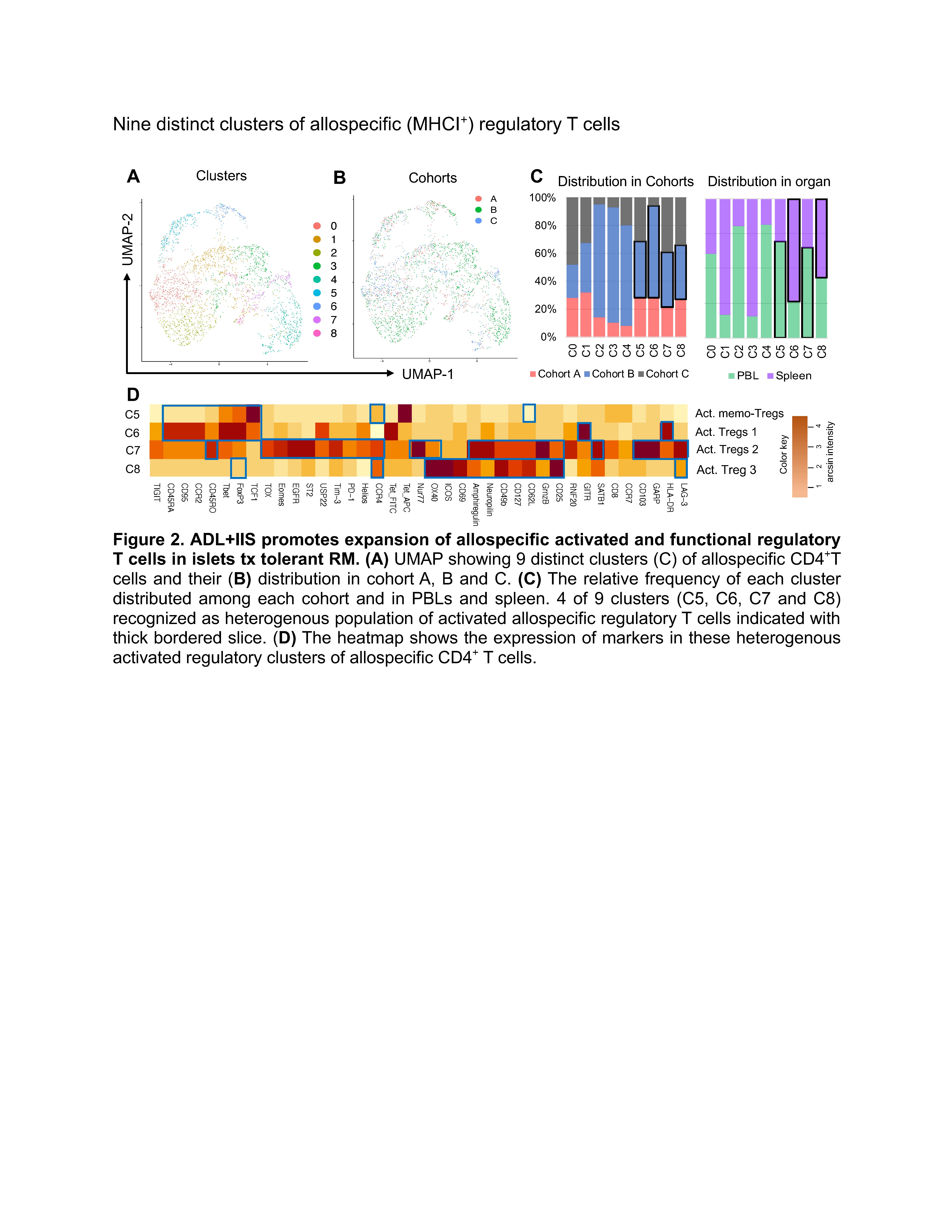 Results: Our analysis demonstrated the ADL+IIS protocol induced exhaustion in allospecific CD4+ T cells. We identified the presence of 9 distinct clusters of allospecific MHC class I+ CD4+ T cells, among these clusters, 4 were T cells expressing markers associated with exhaustion (C0, C1, C3, and C4). The clusters C0 and C1 (abundant in blood) were expanded in cohort C, while clusters C3 and C4 (abundant in spleen) showed comparable frequencies across cohorts. Next, we examined the regulatory heterogeneity of MHCI+ regulatory T cells (Tregs) and identified 9 distinct clusters, with 4 of 9 clusters recognized as heterogenous subpopulation of activated allospecific regulatory T cells, either showing the phenotype of activated FoxP3+ Tres (C5, C6, and C7) or LAG-3+ CD49bhi FoxP3low Tregs (C8). Among these regulatory clusters, C5 and C7 dominated in the peripheral circulation while C6 and C8 showed high abundance in the spleen compartment.