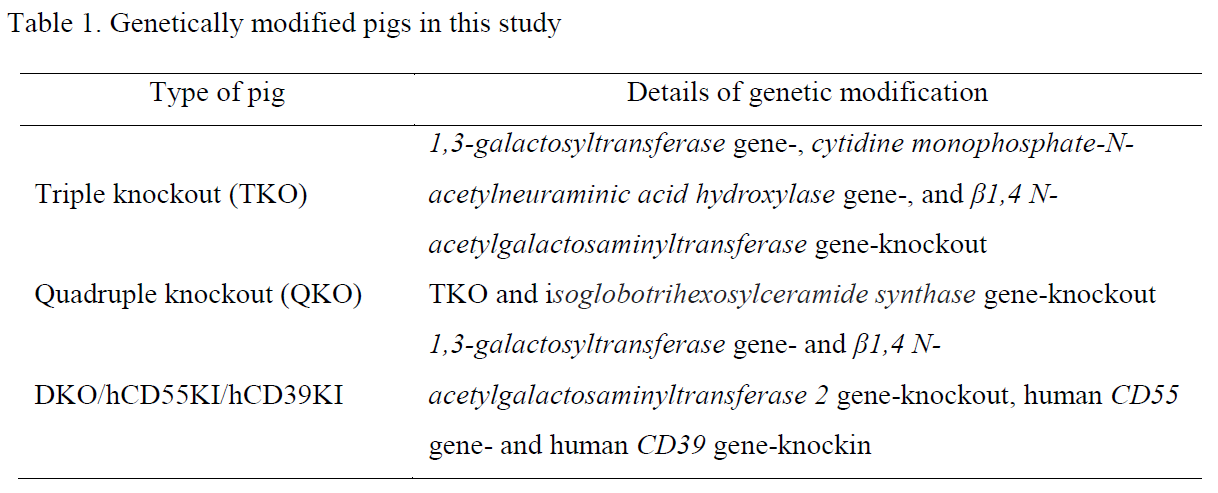 Methods: We commercially acquired human complement-competent serum, complement 7 (C7)-deficient serum, and hRBCs of all ABO blood types. Additionally, we utilized leftover clinical samples from health checkups for further evaluation. The pRBCs were collected from wild-type (WT) and genetically modified pigs (Table 1). The extent of C3 deposition on the RBCs was measured by flow cytometry post-incubation in C7-deficient serum diluted in Ca++-enriched (total complement activity) or Ca++-depleted buffer (only alternative pathway complement activity). Immunoglobulin (Ig)M/IgG antibody binding to the RBCs post-incubation in each ABO type human serum was evaluated by flow cytometer. Human serum-mediated hemolysis of O-type hRBCs and genetically modified pRBCs was also tested.