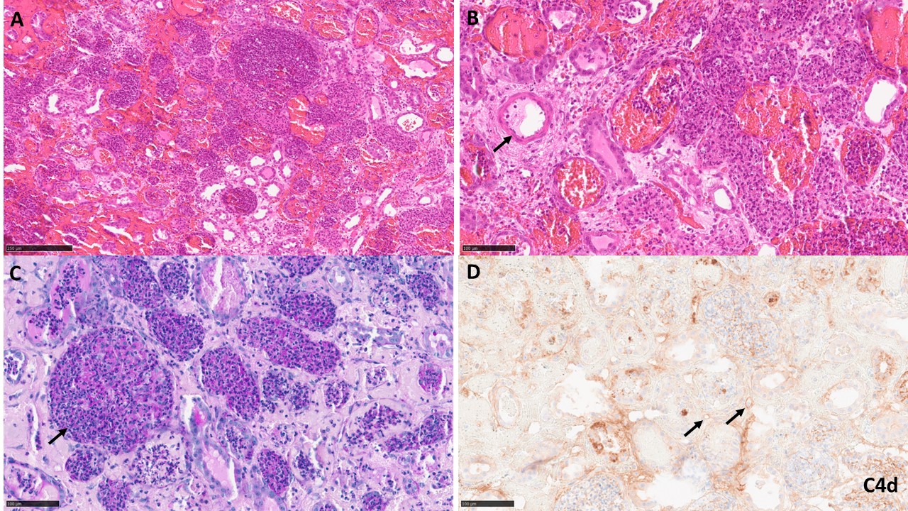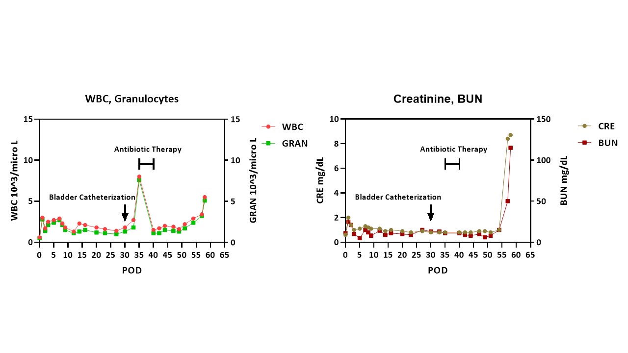 A baboon (blood type B) received a kidney from a pig (type O) with 10 gene edits. Induction therapy was with ATG, rituximab, and a C1-esterase inhibitor, and maintenance with an anti-CD154mAb, rapamycin, steroids, and tocilizumab. Pig kidney function was excellent for almost 2 months (Figure1 right). However, a catheter was passed on day 30 to obtain urine for measurement of proteinuria. Within 4 days, an increase in the granulocyte count was detected (Figure1 left). Antibiotic therapy was initiated, resulting in a temporary reduction in white blood count before it began to increase again. Urine culture revealed no microorganisms. However, the creatinine rapidly rose from 1.0 to 8.4mg/dl, necessitating euthanasia. Histopathology showed unusual neutrophil infiltrates suggestive of pyelonephritis (and/or possibly AMR) (Figure2), Retrospective measurement of serum showed no increase in anti-TKO pig antibodies.