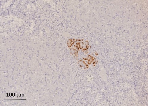 Methods: Minimal invasive percutaneous intraportal islet transplantation (PIPIT) was performed to transplant wild-type NPIs (3,300 – 9,700 IEQ/kg body weight) in diabetic INSC94Y transgenic pigs (n = 4) (1). Immunosuppressive regime was adapted from the Edmonton protocol. It consisted of tacrolimus (0.25 mg/kg BW) and mycophenolate mofetil (500 mg) every 12 hours orally, starting one day before transplantation. In addition, the pigs obtained a daily dose of acetylsalicylic acid (100 mg) as anti-platelet treatment. In the observation period, post transplantation fasting blood glucose values were examined on a regular basis. For animal welfare reasons exogenous insulin replacement therapy was performed according to the measured blood glucose values. After a post-transplantation monitoring period between 71 to 103 days, the liver was systematically processed for detailed histological analysis of graft clusters.