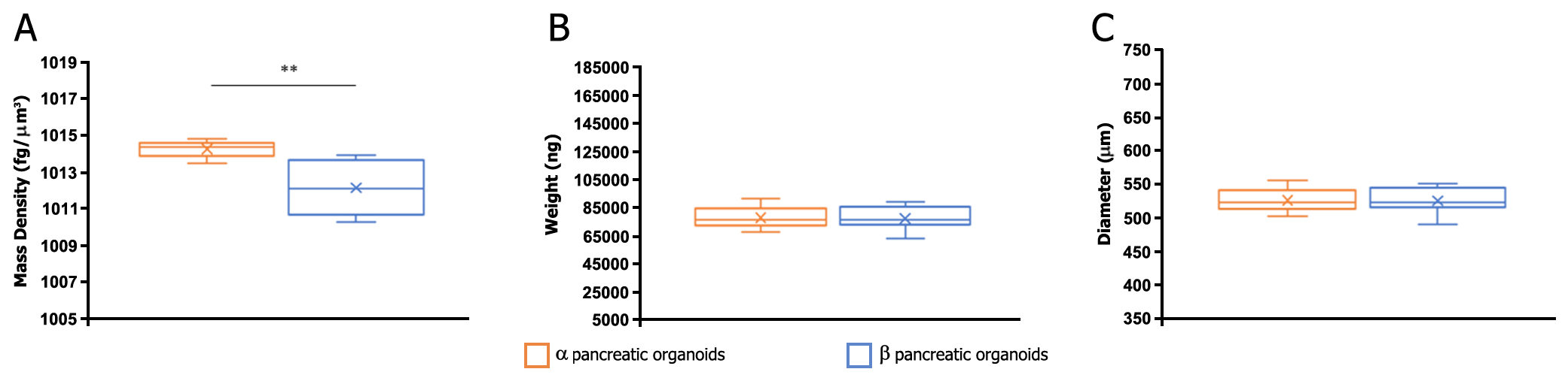 Method: Biophysical characterization was performed using a physical cytometer that allows for simultaneous measurement of mass density, weight, and size of the pancreatic organoids using a label-free technique combined with specific sorting. Two different differentiation protocols for hiPSC-derived pancreatic organoids (named α and β) were applied and initial results obtained with the physical cytometer were compared with the classical biomolecular methodologies for pancreatic function, such as analysis of pancreatic gene markers, and protein expression (data not shown). Organoids were then sorted by size for a fine sample standardization to better highlight biophysical differences. This allowed us to standardize samples derived from both protocols to undertake and improve their comparative analysis.