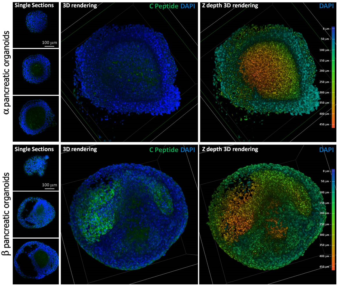 Conclusion: These results demonstrate that differentiated pancreatic organoids can be readily pre-screened and monitored using non-invasive techniques, which preserves the integrity of the organoids allowing for their future use, both in vitro and in vivo. This technology can also be used for other types of organoids, either healthy or diseased, such as cancer organoids, allowing for predictive non-invasive screening and clear capacity for comparison in a whole series of disease states.