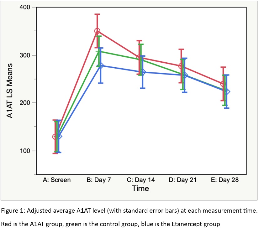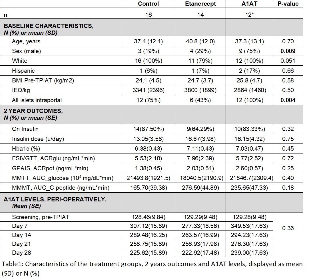Results: Participants were adults average 38.5 (SD 12) years old, 17 (40%) males. Cytokine measures, especially IL-6, IL-8, IL-10, and MCP-1, were elevated during and after TPIAT. However, only TNFa differed significantly by treatment, with highest levels in the etanercept group (p=0.027). A1AT levels increased significantly above pre-TPIAT baseline in all 3 groups (p <0.001, Figure 1), with the highest levels in the A1AT-treated group. At 2 years, insulin dependence and measures of insulin secretion by MMTT, IVGTT and GPAIS were similar in all groups (Table1).