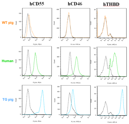 Results: CD55#1 pigs and CD55#2 pigs were produced with and without a marker gene, respectively. The expression level of the hCD55 protein on PBMCs in CD55#2 pigs was 8 times higher than that in CD55#1 pigs. The expression level of hCD55 in GTKO/SdaKO/CMAHKO/hCD46/hCD55/hTHBD pigs was 10 times higher than that of hCD55 on human endothelial cells (Figure1). All of these hCD55 pigs were healthy and had offspring.