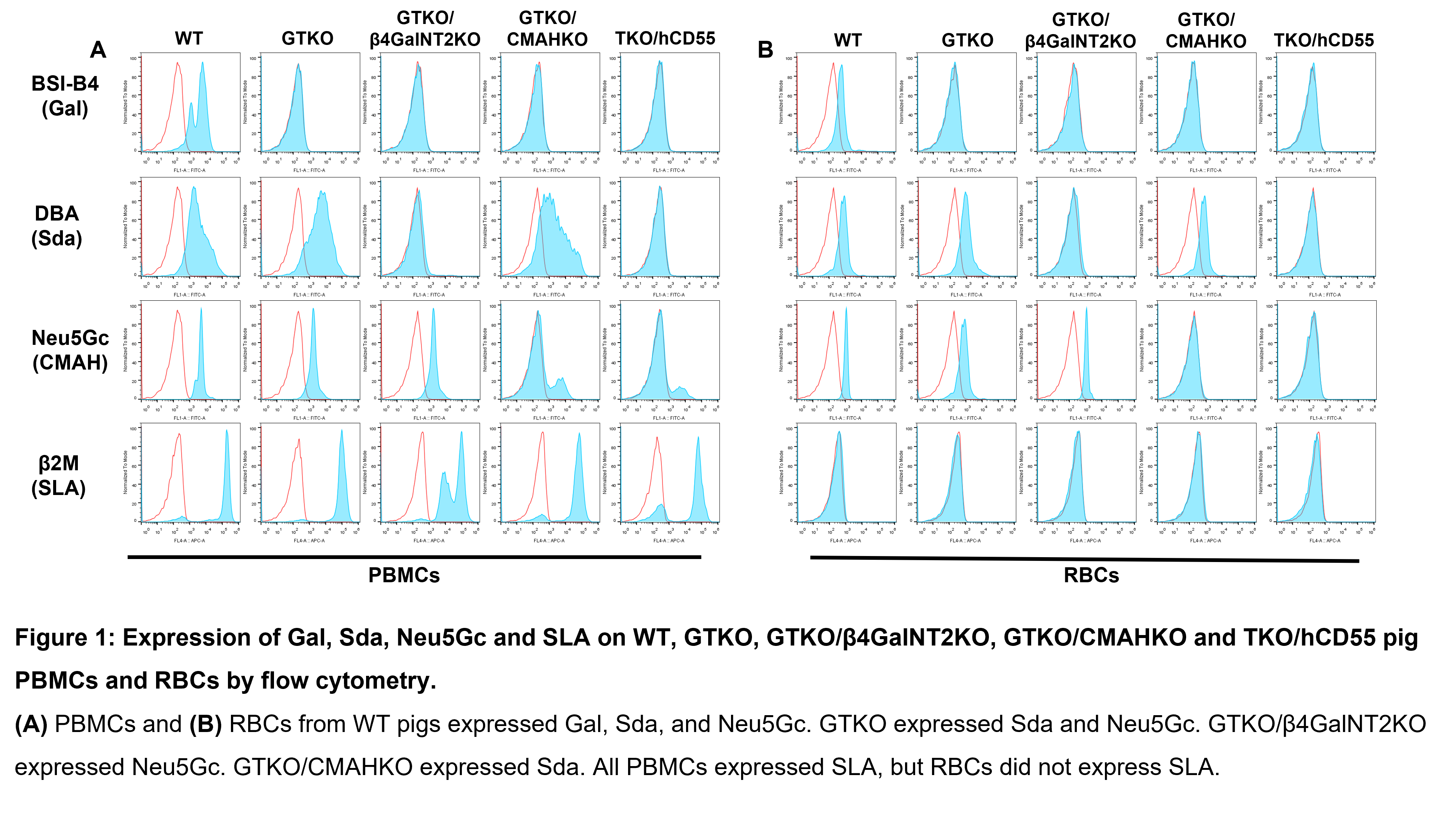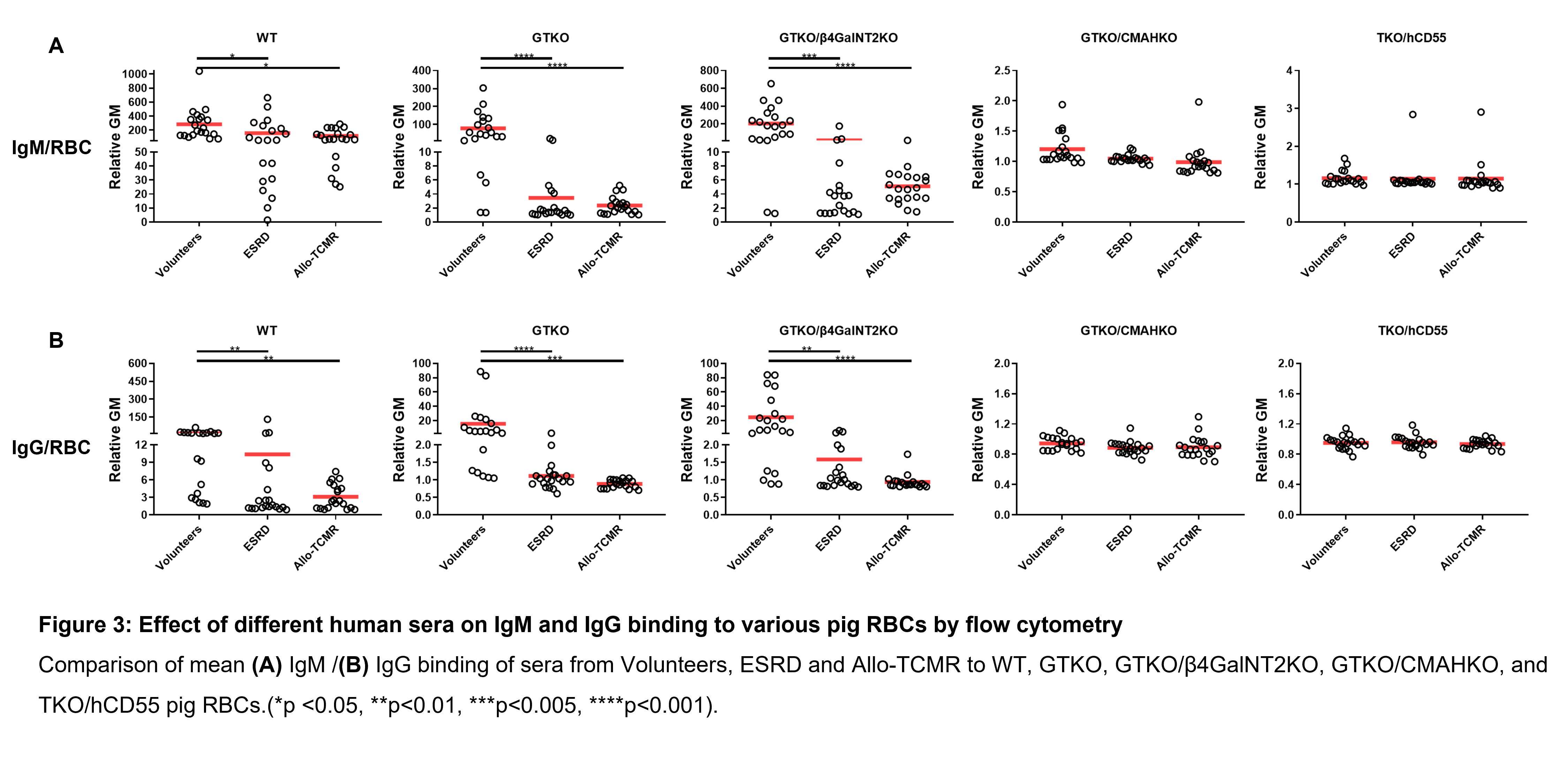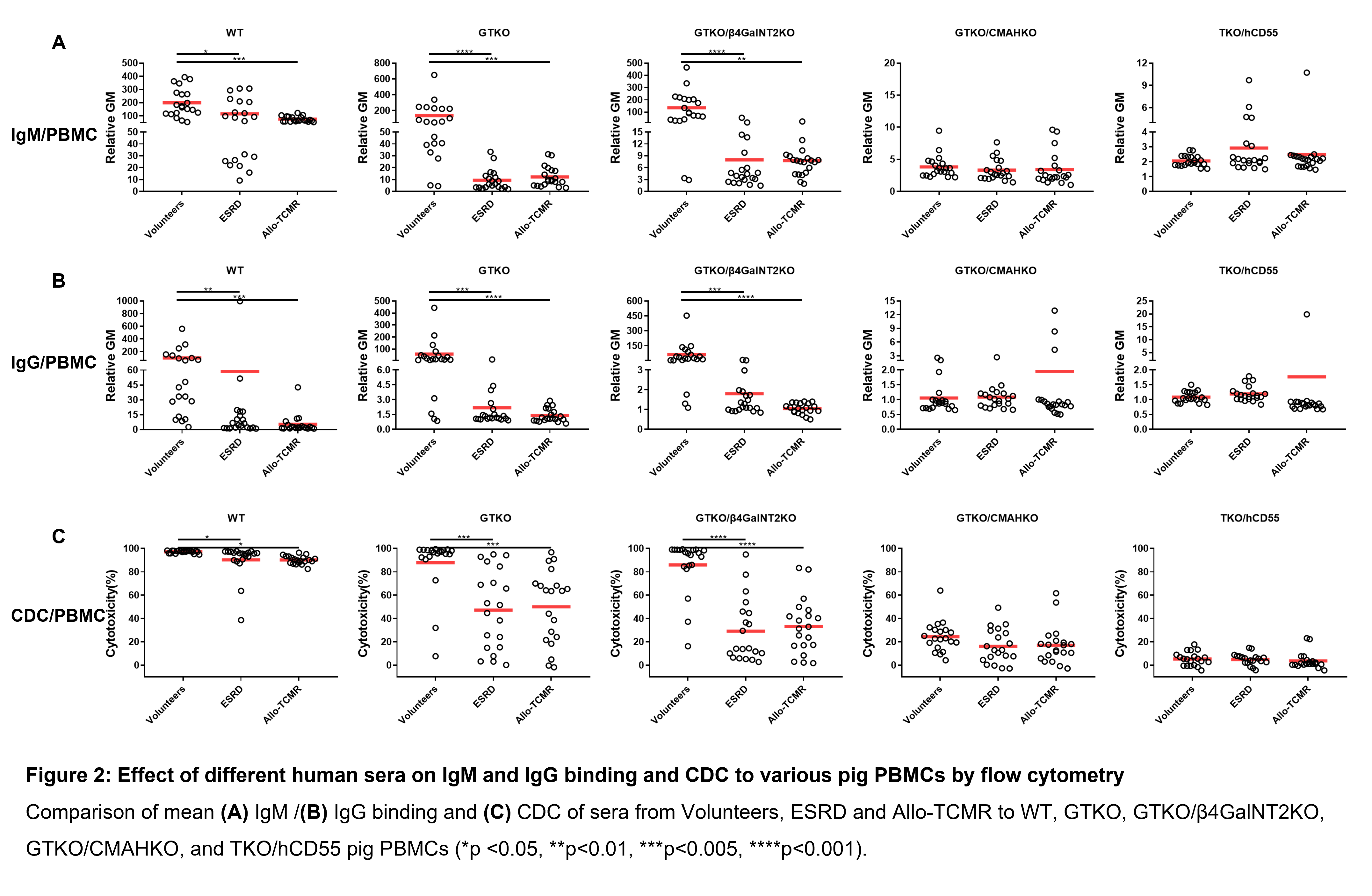 We obtained the following results: (i) Serum IgM/IgG binding and CDC in Volunteers were significantly greater to WT, GTKO, and GTKO/β4GalNT2KO PBMCs or RBCs than to GTKO/CMAHKO and TKO/hCD55 cells; (ii) In all sera, the lowest antibody binding and CDC were to GTKO/CMAHKO and TKO/CD55 pig cells.