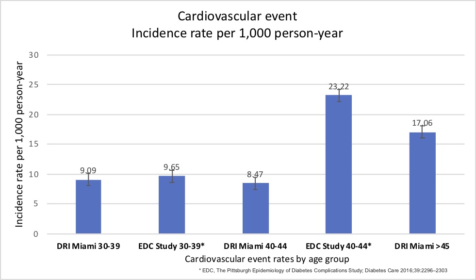 Results: Out of 56 patients, 8 (14.3%) presented CVE, and 3 (37.5%) had residual graft function at the time of event. Median time from first ITx until the occurrence of CVE was 133 (67 – 225) months. Age at CVE was 47±8.7 years, and 37.5% (n = 3) were female. In subjects who had CVE, mean BMI at ITx was 23.85±1.45kg/m2 and by the end of follow-up was 23.62±3.05kg/m2, which is not different from the BMI in subjects without CVE (P=0.509). Young adults aged 30–39 years had a CVE rate of 9.09/1,000 person-years (95% CI 2.3 - 50), those aged 40–44 years had a rate of 8.47/1,000 person-years (95% CI 2.15 - 47), and subjects aged >45 had a rate of 17.05/1,000 (95% CI 9.19 – 41) person-years. The Pittsburgh Epidemiology of Diabetes Complications Study Cohort reported a higher incidence rate of CVE in T1D in comparison of our cohort, considering the same age groups.