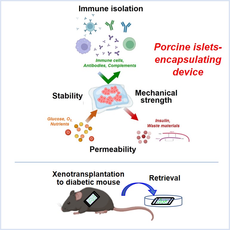 Introduction: Islet transplantation is an effective treatment for type 1 diabetes (T1D). However, donor shortages and the need for immunosuppressants are major challenges. The solution would be to develop a source of insulin-secreting cells and immunoprotective strategies. We have previously developed a novel device with immunoisolation ability for xenotransplantation, and have published that the device encapsulating porcine islets can improve glycemic control for more than 200 days without immunosuppressive drugs when transplanted in immunocompetent diabetic mice (2022 Cell Rep. Methods, K. Ajima et al.) However, the diabetes improvement rate was about 60%, so we improved the fabrication of the device. In this presentation, we report a device that encapsulates porcine islets with a highly stable and permeable hydrogel and a biocompatible immunoisolation membrane.