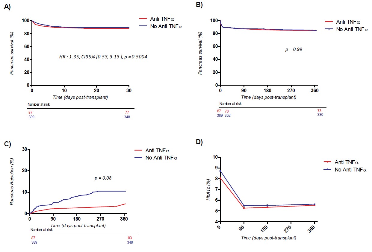 Conclusion. The use of an induction treatment with anti-TNFα after pancreas transplantation was safe and did not increase in the number of infectious episodes. The number of thrombosis was similar in both groups and pancreas survival was not improved during the first year of transplantation. A reduction in the occurrence of rejections was indeed observed. Combining anti-TNFα and anti-IL1β, as suggested in the field of islet transplantation, will be evaluated in our institution.