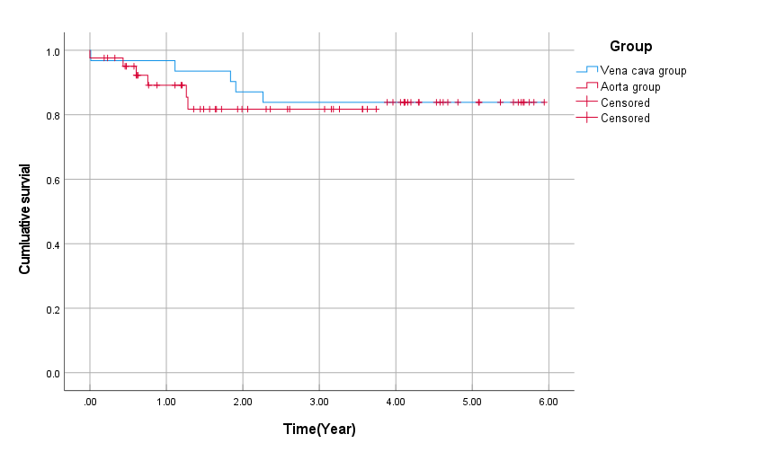 Result: Between the two groups, there was no significant difference in baseline characteristics. Each group had one and two instances of technical failure. Early graft failure rates were 3.2% and 4.7%, respectively (p=1.000), while 1-year graft survival rates were 96.8% and 92.3 %, respectively (p=0.580). Despite the fact that a graft-threatening thrombosis occurred in the vena cava group, neither group, particularly the aorta group, experienced thrombotic graft failure, despite the absence of heparin use.