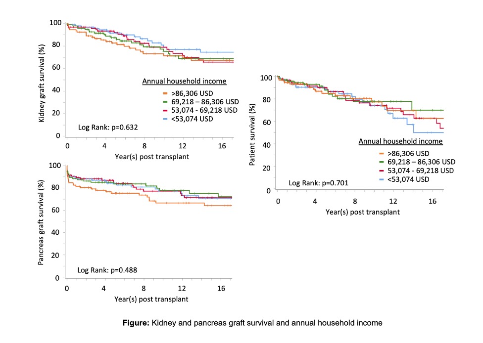 Methods: A retrospective cohort study consisting of 377 SPK recipients between 1991 and 2022 was performed. SES was measured using average household income data from reported United States tax statistics. Recipients were stratified into four quartiles based on income. Univariate Kaplan-Meier curves were generated to analyze survival.