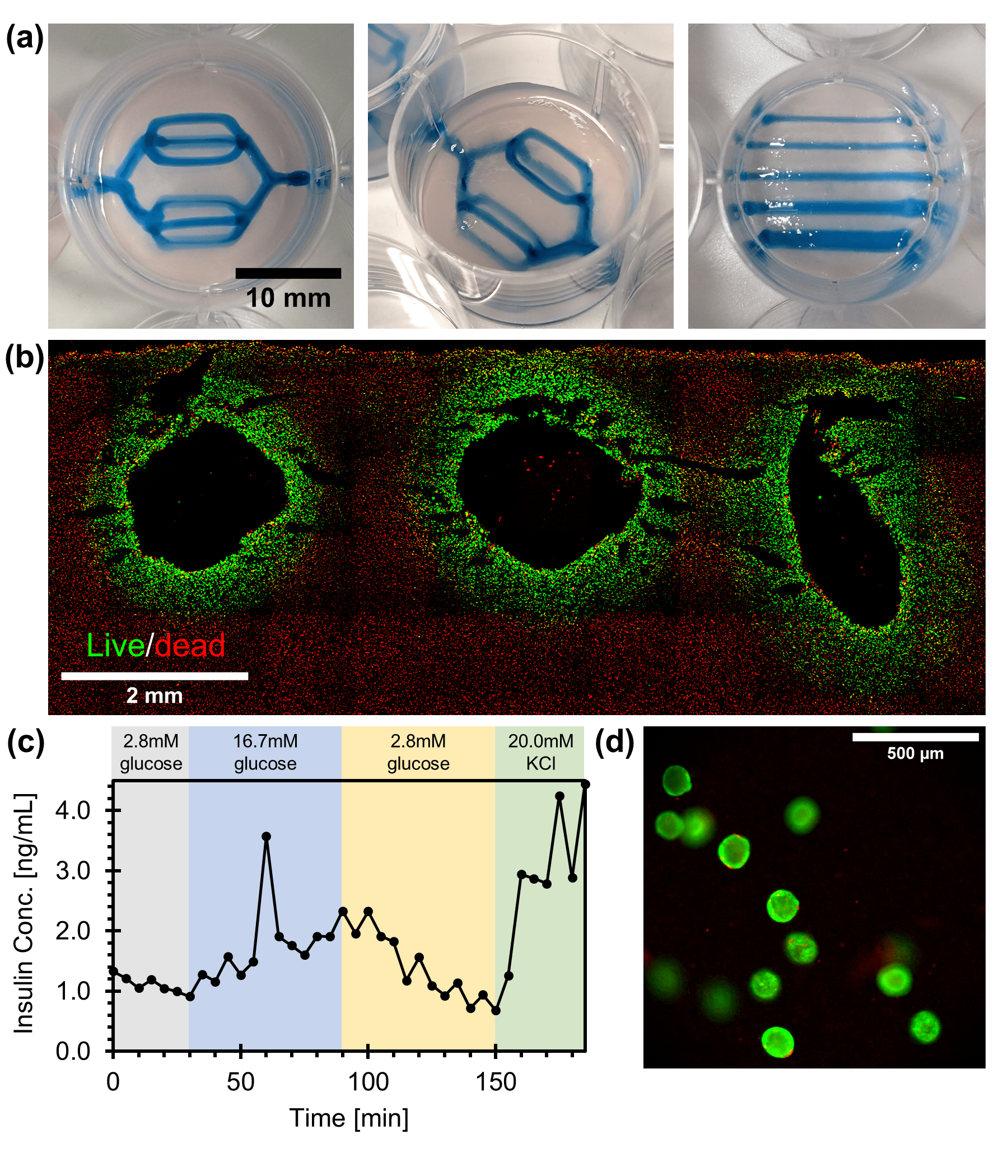 Results: We show that self-healing matrices can be engineered from alginate by crosslinking it with 10.0 to 25.0 mM of calcium ions. We then measured the self-healing property of these materials by their yield stress (11.0±0.6 to 51.0±3.5 Pa), flow index (0.48±0.01 to 0.53±0.02), and consistency index (12.9±0.5 to 18.3±2.9). Formulations characterized by an Oldroyd number of ~1.52 yielded the most reproducible prints and were conducive to generating multi-branched vascular networks (Fig. 2a). Filament diameters were controlled (0.4-1.8 mm) by varying print speeds. Both MIN6 cells and iPSC-derived pancreatic endoderm cells or aggregates (Fig. 2d) retained high viability immediately after immobilization (≥90%). Following 2 days of perfusion culture, irrigated MIN6 constructs remained viable within a 600±85 μm radius of each channel and were glucose responsive (Fig. 2b and 2c). MIN6 tissues with more complex vascular networks (up to 10 branching channels) remained viable after 2 days of perfusion as well. Similarly, only the iPSC-derived pancreatic progenitor aggregates localized around the perfusion channels remained viable following 5 days of perfusion culture.