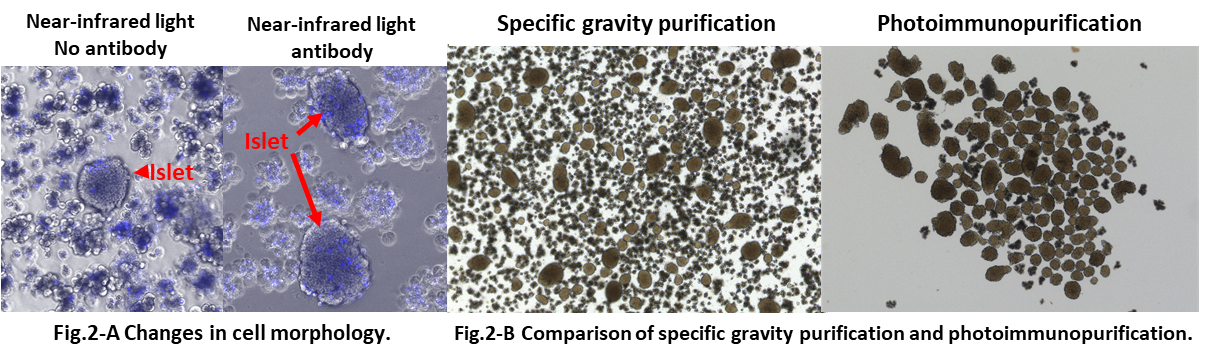 The 'quantity' and 'purity' of the islets transplanted have a significant impact on the transplantation outcome of islet transplantation. On the other hand, the conventional 'purification' of islets by density gradient centrifugation based on the different densities between islets and exocrine cells does not allow many islets to be recovered because the difference in density between islets and exocrine cells is slight, and a certain amount of exocrine cells are also mixed in. In order to overcome these problems, we considered a method completely different from purification using specific gravity and devised a purification method focusing on the high specificity of 'photoimmunotherapy1'.