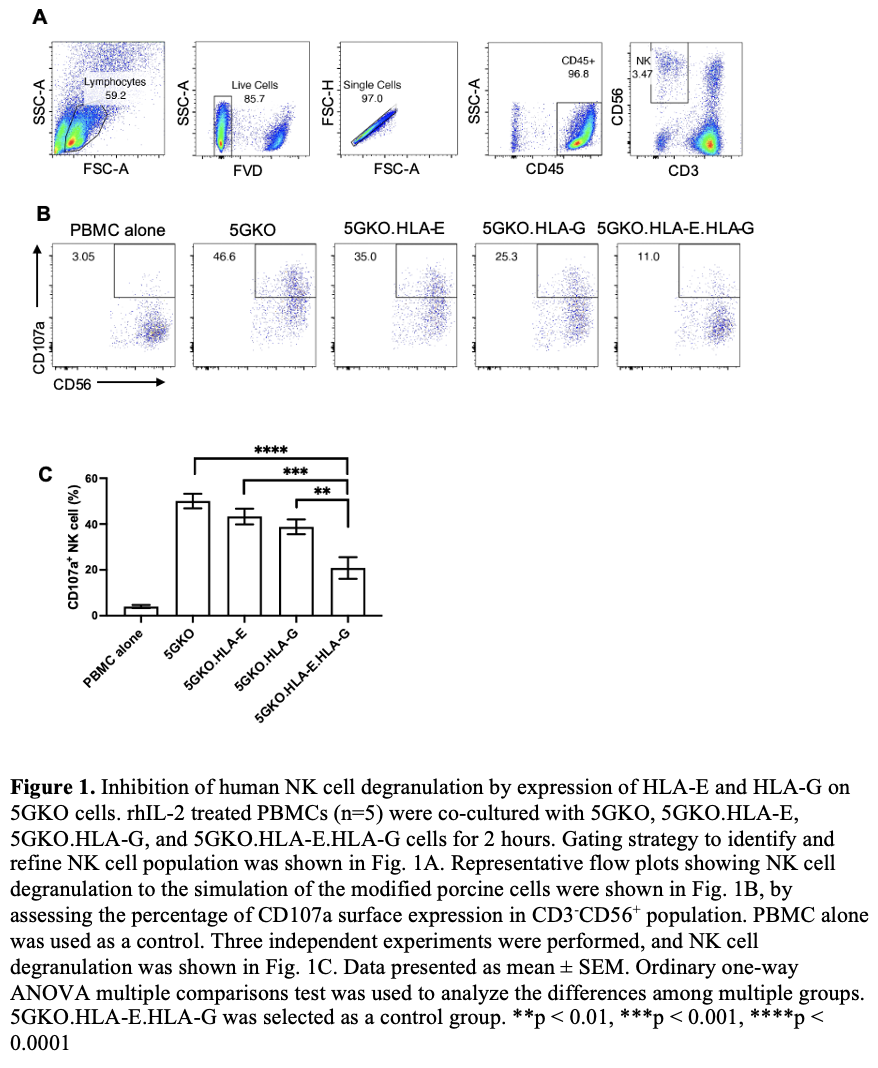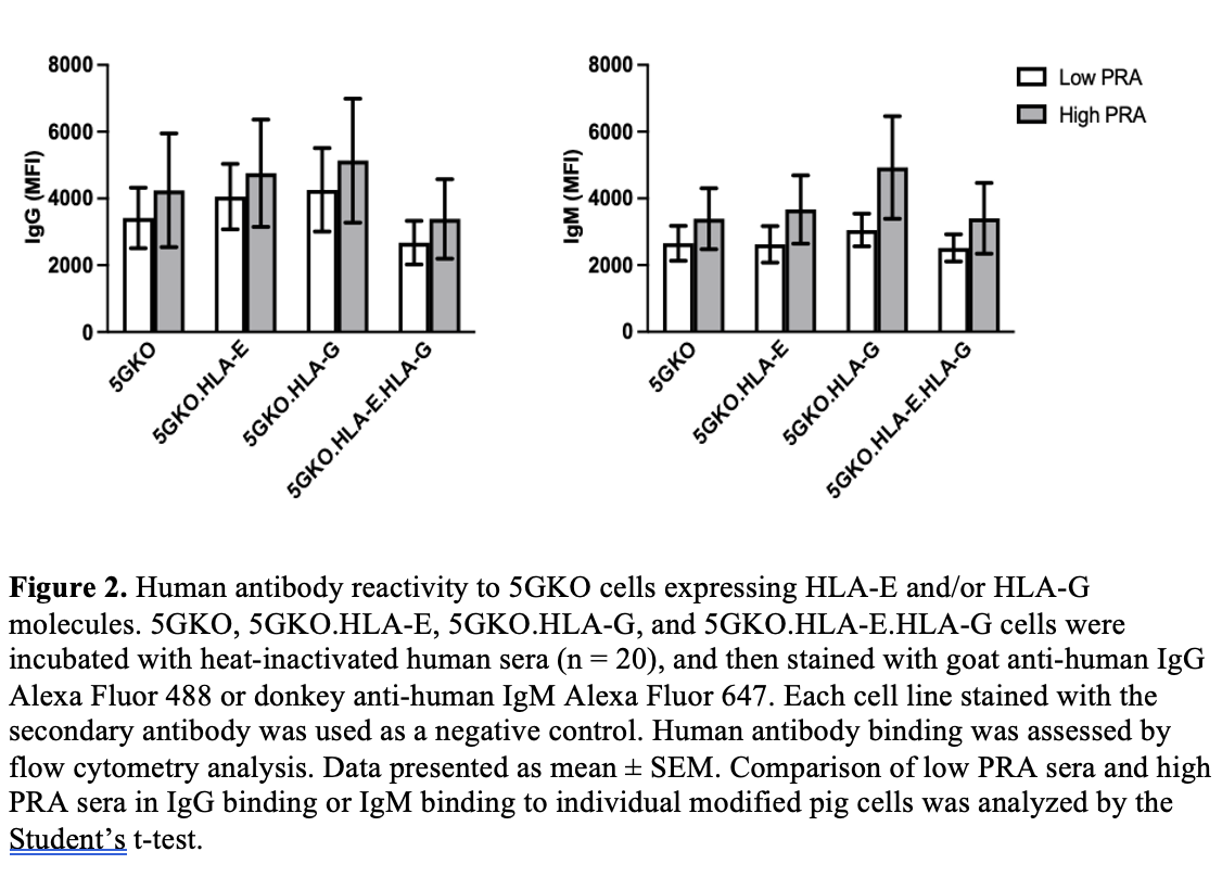 Methods: HLA-E or HLA-G gene along with beta-2-microglobulin gene were engineered and introduced in a 5-gene knockout porcine endothelial cell line (5GKO, GGTA1/CMAH/β4galNT2/SLA-I α chain/β-2 microglobulin) by electroporation. Transfected porcine cells were cultured in selection media. HLA-E and/or HLA-G positive cells were isolated by fluorescence-activated cell sorting. Human NK cell degranulation was assessed by flow cytometry analysis of CD107a positive cells in CD3-CD56+ population from human blood peripheral mononuclear cells. CD107a is a sensitive marker of NK cell activation and correlates with NK cell cytotoxicity. Human sera were obtained from patients on the kidney transplant waitlist, 10 sera with high panel reactive antibody (PRA) and 10 sera with low PRA, for a total of 20 samples (n = 20). Human IgG and IgM antibody reactivity to HLA-E and/or HLA-G on pig cells was examined by flow cytometry analysis.