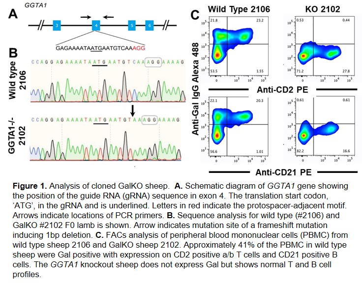 Methods: PCR primers were designed according to sheep GGTA1 genome sequences (GenBank, NC_040254.1) to amplify exon 4 and partial intron flanking sequences (522bp). Exon 4 contains the translation start signal. Sheep fetal fibroblasts (SFFs) were transfected by electroporation with ribonuclear complexes containing Cas9 protein and an exon 4 specific gRNA, (Figure 1A). Single-cell-derived transfected SFF colonies were isolated by limiting dilution and screened by PCR and Sanger sequencing for biallelic mutations (Figure 1B). Male and female GGTA1-/- SFF colonies were used as donor cells for somatic cell nuclear transfer. Peripheral blood mononuclear cells (PBMCs) from cloned sheep were screened for Gal expression and serial serum samples were assayed by ELISA for anti-Gal antibody. Sheep antibody binding and cytotoxicity was assessed by flow cytometry using HEK cells expressing porcine GGTA1.