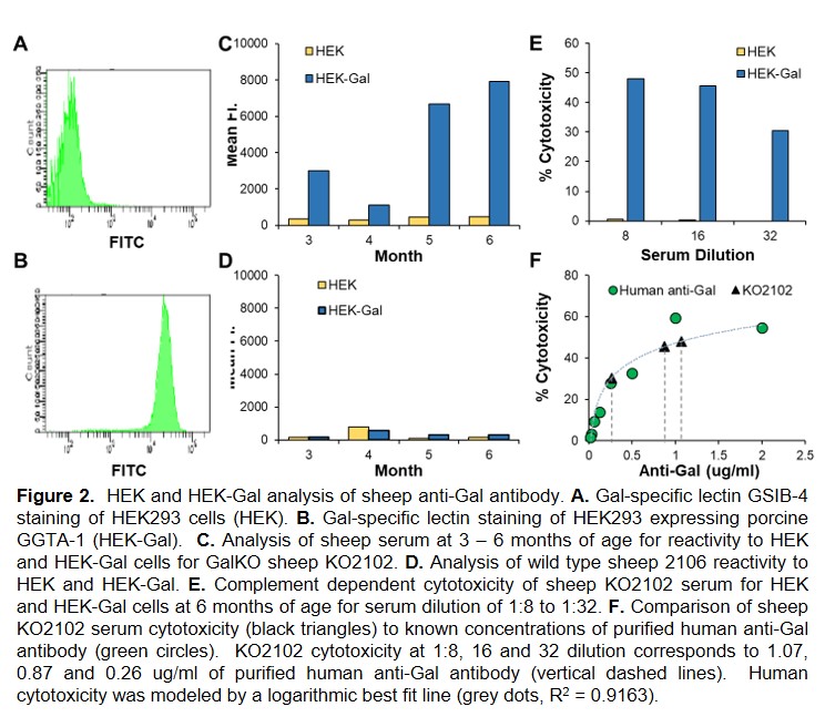 Results: To date 22 pregnancies carrying male and female GGTA1-/- SFF have been established and two GGTA1-/- sheep (Gal-KO) have been analyzed. Gal-KO sheep are devoid of the Gal antigen (Figure 1C) and begin expressing cytotoxic anti-Gal antibody by 2 - 3 months of age which increased to clinically relevant levels by 6 months of age (Figure 2).