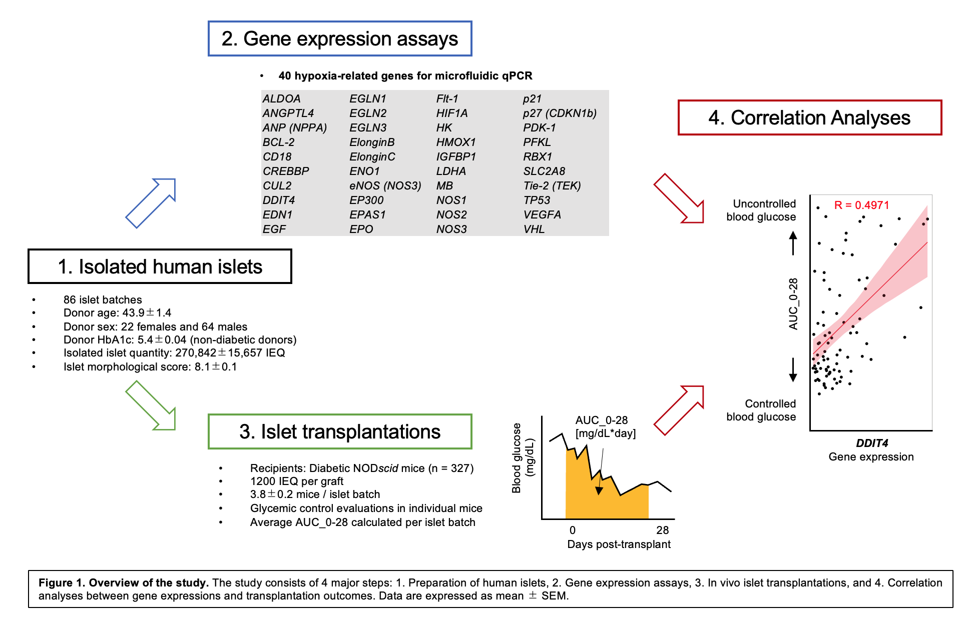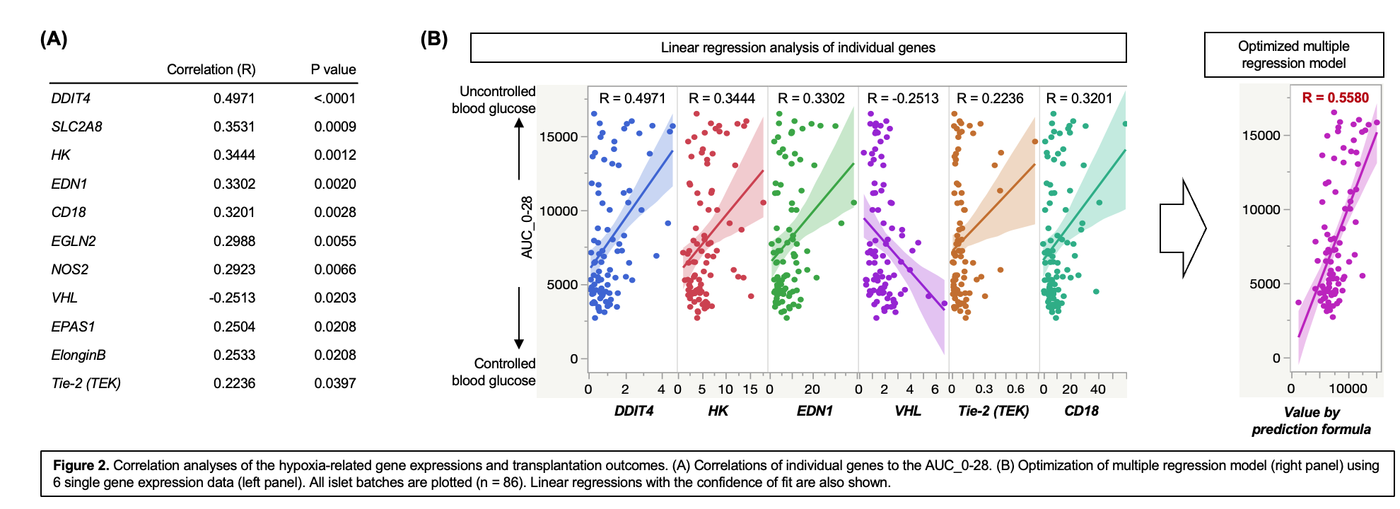 Methods: An overview of the study is shown in Figure 1. Human islets from deceased donors were isolated at City of Hope (n = 86 batches). Islets were transplanted under the kidney capsule of streptozotocin-induced diabetic NOD-scid mice (1200 IEQ per graft, 327 mice). Post-transplant glycemic control was assessed quantitatively using the area under the curve (AUC) of blood glucose from days 0–28 (AUC_0-28 [mg/dL*day]) in individual mice [1] and averaged per islet batch. Note that low AUC_0-28 indicates controlled post-transplant blood glucose level, and low AUC_0-28 is highly correlated to the diabetes reversal in mice [1]. Microfluidic qPCR of 40 hypoxia-related genes was employed using RNA from pre-transplant islets, and gene expressions were normalized to a housekeeping gene. Correlations between gene expressions and AUC_0-28 were calculated using linear regression. Multiple regression analysis was further employed to generate an equation for predicting the transplantation outcomes.