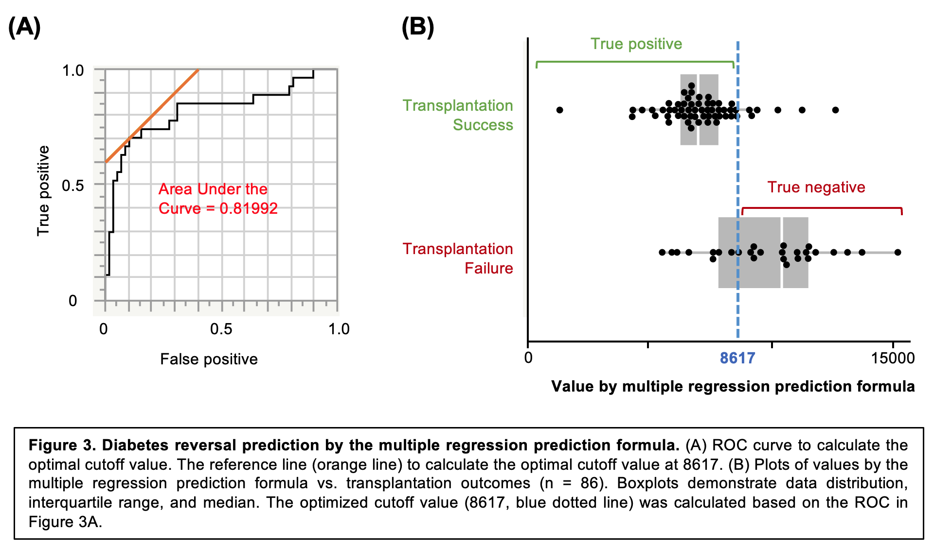 Results: Among 40 genes examined, 11 genes were significantly correlated to the transplantation outcome, (Figure 2A). Of note, DDIT4 expression demonstrated the highest correlation to the transplantation outcomes (R = 0.4971, P <0.0001). Further, we generated the prediction formula using multiple regression model with 6 genes (Prediction value = 7111 + 62*CD18 -116*EDN1 + 313*HK + 5059*Tie-2 - 1295*VHL + 1177*DDIT4), which demonstrated the improved correlation to transplantation outcome (R = 0.5580, Figure 2B). Lastly, we applied the prediction formula to predict diabetes reversal (qualitative factor), which calculated a high AUC of Receiver Operating Characteristic (0.81992, Figure 3A), with high sensitivity at 70.4% and specificity at 90.0% in predicting transplantation success (Figure 3B).Conclusions: Hypoxia-related genes of pre-transplant human islets are promising prediction markers for islet transplantation outcomes in diabetic mice. Notably, a multiple regression model of hypoxia-related genes was highly predictive of transplantation outcomes.