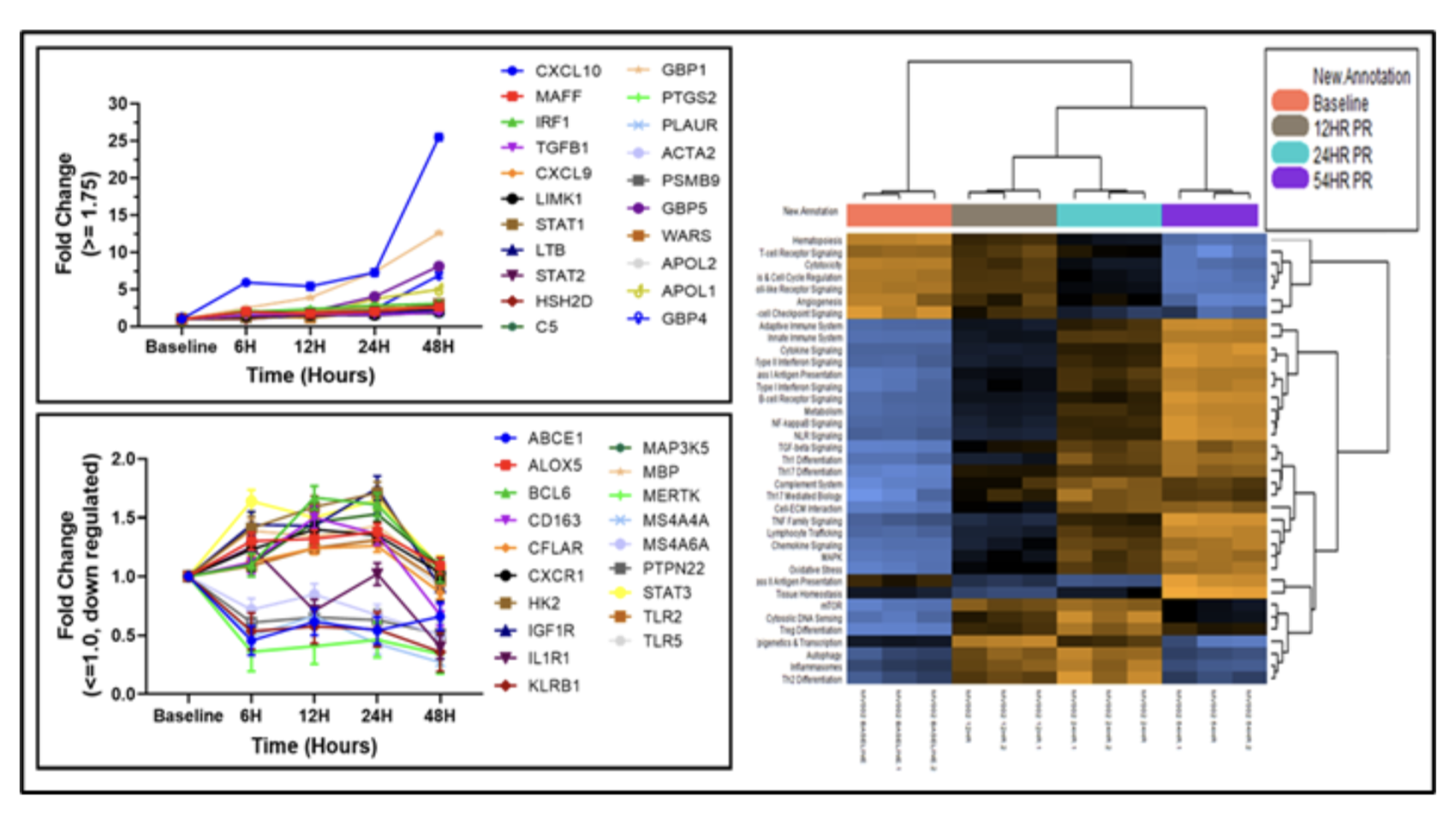 Results: Differentially expressed genes, which promote as well as attenuate rejection, were noted. Genes identified as biomarkers of rejection, graft outcome, and immunosuppression response included CXCL10 expression with a 25-fold higher at 48 hours compared to baseline (p<0.0001) along with GBP1 (FC=12.6, p<0.0001) and GBP4 (6.89 FC, p<0.0001). Conversely, CD163, a macrophage marker associated with chronic allograft function, decreased at 48 hours (FC= 0.673, p<0.0001), as did MS4A6A (FC= 0.503, p<0.0001), which is elevated after complement deposition and accumulation of natural killer cells and monocytes/macrophages in capillaries. Macrophage, T-cell, cytotoxic T cell, and CD45 scores decreased significantly at 48 hours. Pathway analyses were notable for decreased T-cell receptor, check point signaling, Toll-like receptor signaling, and angiogenesis at 48 hours along with increased cytokine, interferon and chemokine signaling.