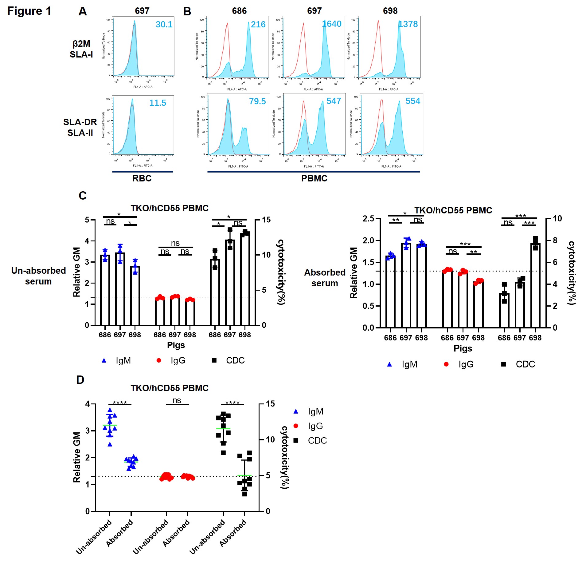 Results: A significant reduction in IgM/IgG binding and CDC was observed in the absorbed sera. The SLA expression is difference in each pig. IgM antibodies (but rarely IgG) against unknown xenoantigens expressed on TKO/hCD55 PBMCs, possibly against SLA, were documented in healthy humans, patients with ESRD, and those with renal allografts undergoing acute T cell rejection. IgM (but not CDC) was higher in patients experiencing allo-TCMR.