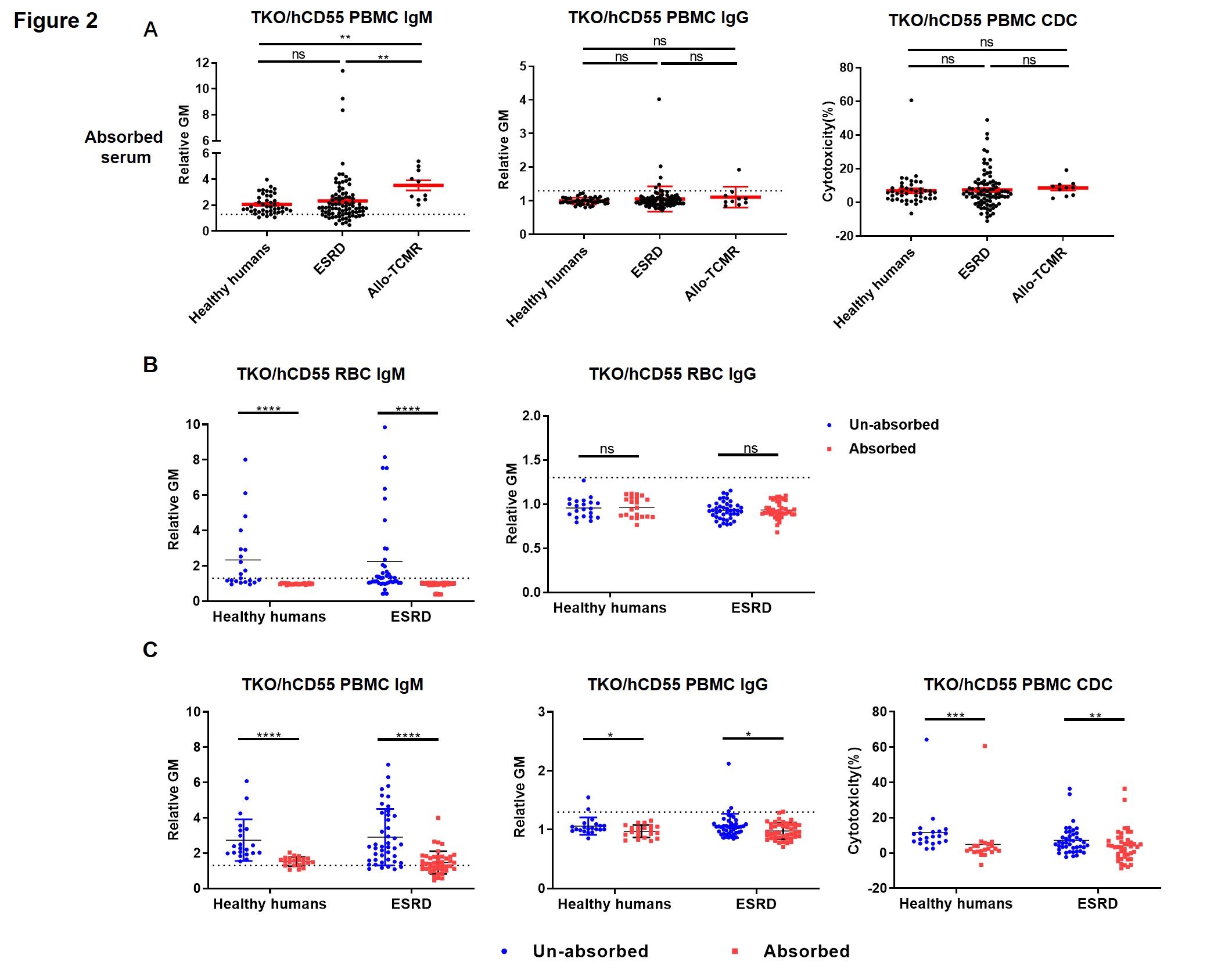 Methods: We collected blood from TKO/hCD55 pigs (n=3), and isolated PBMCs and RBCs. Serum samples were collected from(i) healthy volunteers (n=43), (ii) patients with end-stage renal disease (ESRD) (n=87), and (iii) renal allotransplant recipients who were currently experiencing T cell-mediated rejection (allo-TCMR, n=10). The sera were initially incubated with TKO/hCD55 pRBCs to absorb anti-pig antibodies (except against SLA and possibly other antigens not expressed on pRBCs) and then the serum (absorbed or unabsorbed) was tested for antibody binding and complement-dependent cytotoxicity (CDC) to TKO/hCD55 pig PBMCs.