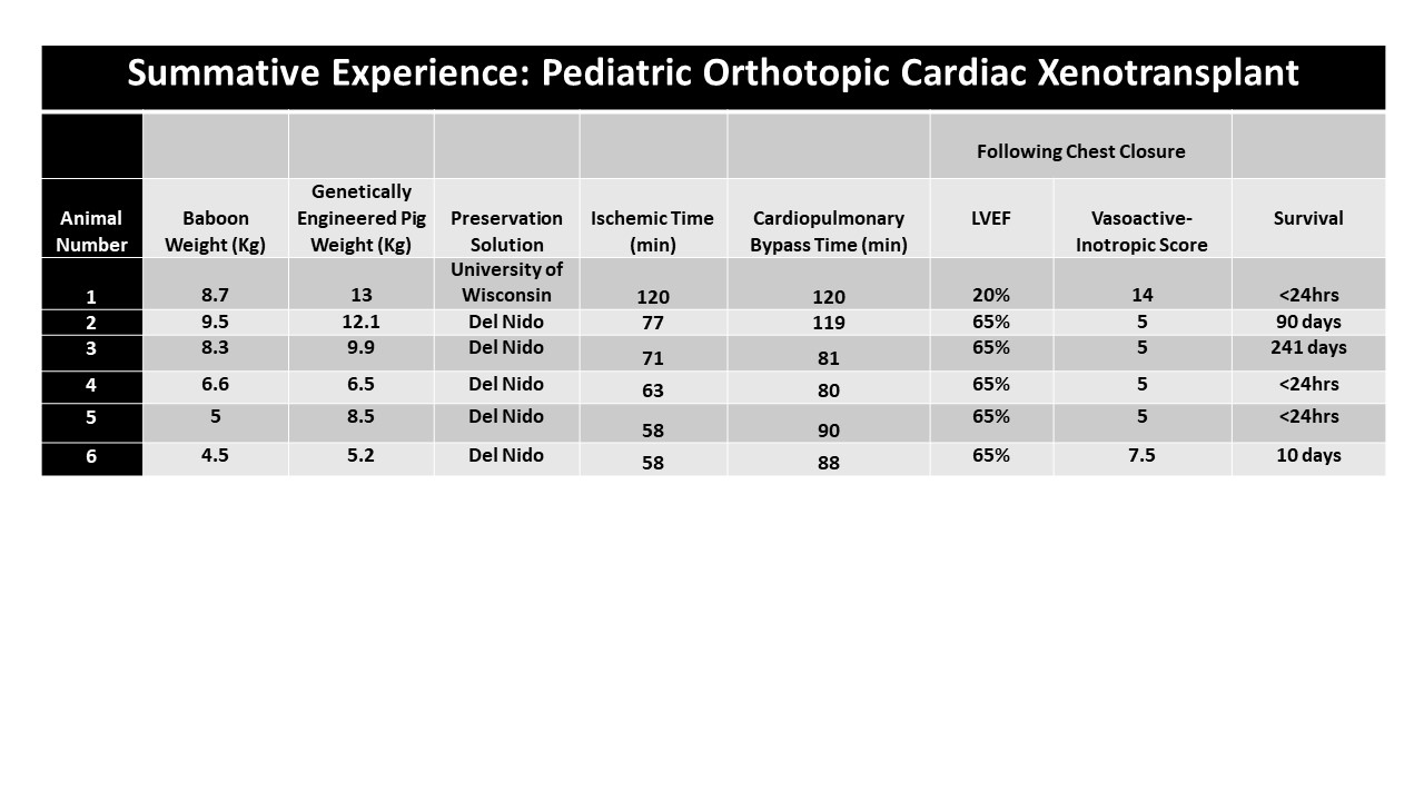 Method: We carried out 6 cardiac xenotransplants from genetically modified pigs to papio hamadryas baboons. Recipient weights ranged 4.4 to 9.5 kg, and age ranged from 13 to 24 months of age. The first porcine heart was prepared analogous to human allotransplant: University of Wisconsin (UW) solution for arrest and cold static preservation for 1 hour before transplant. The following 5 porcine hearts were preserved with a modified, hyper-oncotic Del Nido cardioplegia solution followed by immediate implant into our recipient. Post-operative echocardiograms, hemodynamics, and clinical outcomes were tracked.