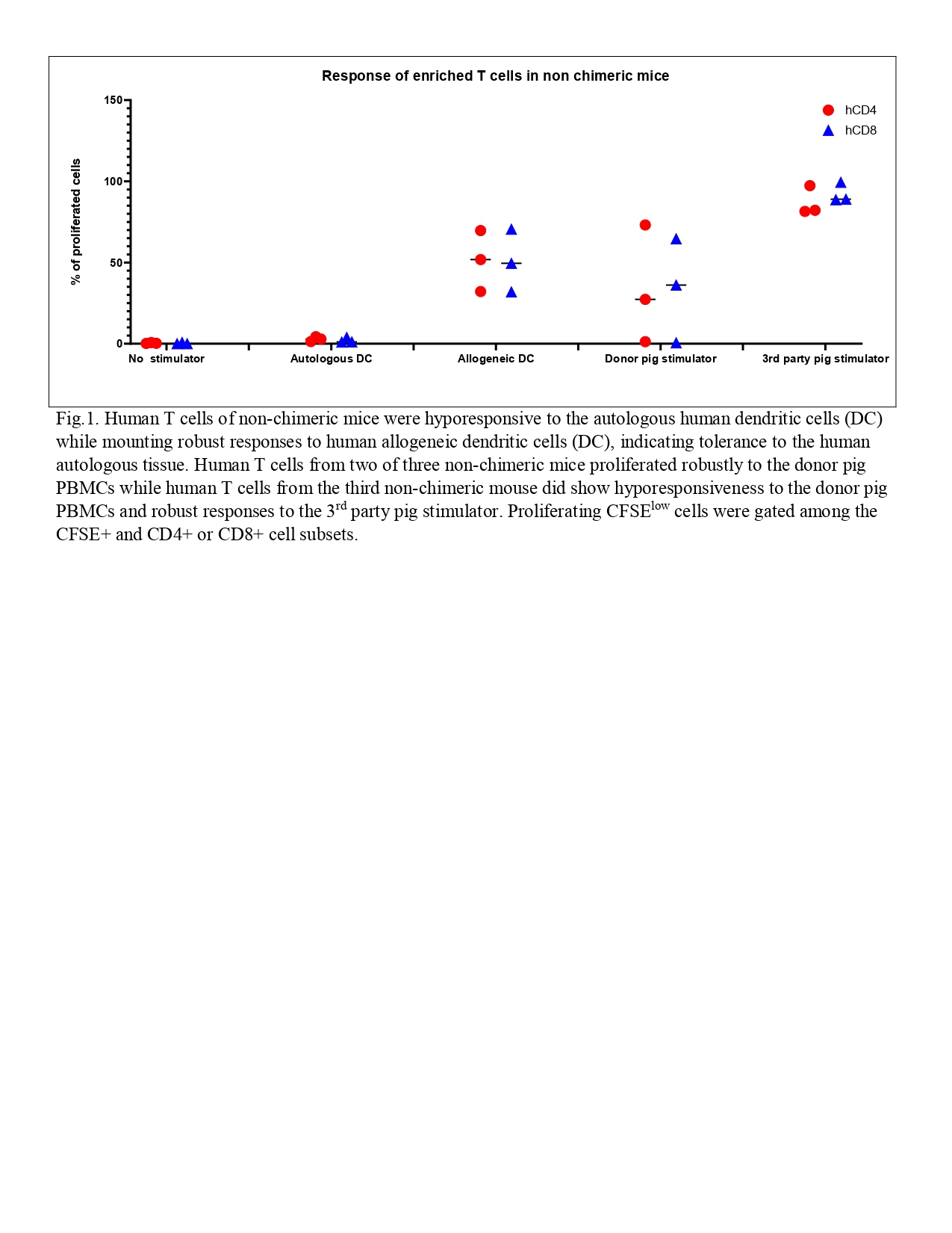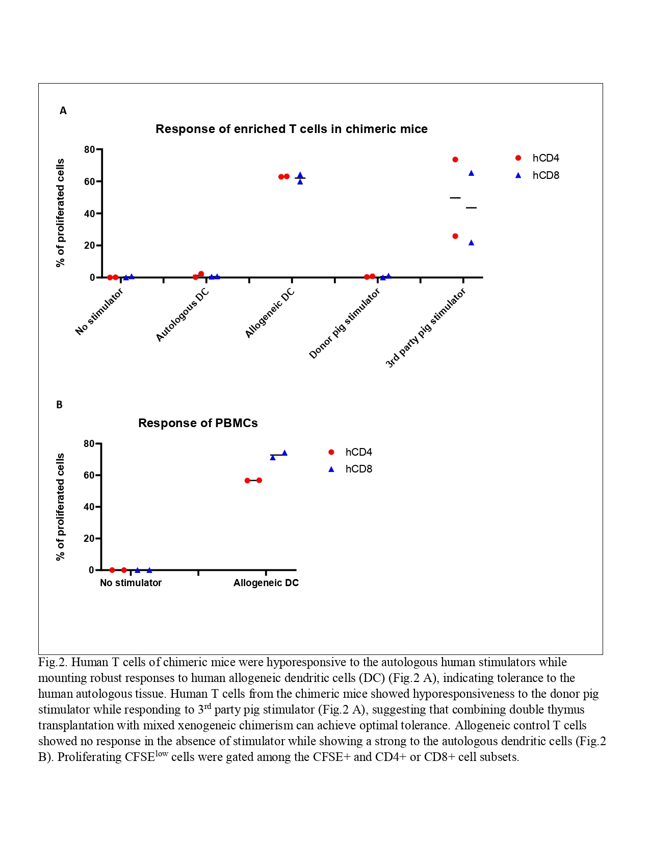 Results: Overall reconstitution of human cells (T cells, B cells and monocytes) in peripheral blood was delayed and reduced in mixed chimeric mice. Pig chimerism consisting mainly of T cells was persistent in chimeric mice. Overall human cell reconstitution was also decreased in spleen and bone marrow in chimeric compared to non-chimeric mice. Pig chimerism was detected in both spleen and bone marrow of chimeric mice. Human T cells from both groups were hyporesponsive to autologous human stimulators while mounting robust responses to human allogeneic stimulators (Fig.1 and Fig.2 A), indicating tolerance to the human autologous antigens. Allogeneic control T cells showed a strong response to the autologous dendritic cells (Fig.2 B). While human T cells from chimeric mice showed specific hyporesponsiveness to the donor pig with robust third-party pig responses (Fig.2 A), human T cells from two of three non-chimeric mice proliferated robustly to the donor pig (Fig.1). These data suggest that specific human T cell tolerance to the donor pig xenoantigens was achieved in the presence of mixed chimerism and a human plus a porcine thymus.