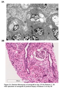 Results: Survival exceeded one year (370 days) in Baboon 2, which was euthanized for reaching endpoint, with no clinical or histological signs of rejection. Two baboons are still under observation and are currently six months (Baboon 4) and five months (Baboon 5) post- transplant, showing no clinical or histological signs of rejection. Three baboons were euthanized shortly after the transplant due to non-immunological complications. Electron microscopy was performed on Baboon 2’s xenograft at the time of euthanasia (H&E and PAS pending), and showed endothelial injury manifested as swollen endothelium with loss of fenestration, and extensive but incomplete foot process effacement (Figure 2A). Baboon 4’s latest biopsy (Day 145) showed mild to moderate tubulointerstitial scarring, along with mild transplant glomerulopathy and minimal C4d staining in peritubular capillaries. Baboon 5’s latest biopsy (Day 98) showed mild to moderate tubulointerstitial scarring with focal acute tubular injury (Figure 2B) and minimal C4d staining in peritubular capillaries. Serum creatinine values for Baboons 2, 4, and 5 stabilized at 2-3 mg/dL, despite occasional spikes in serum creatinine, which were related to urine outflow problems and urinary tract infections, corrected by ureter stent exchanges and/or removal and treatment with antibiotics (Figure 1B).