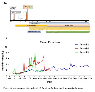 Methods: Six baboons with low non-Gal anti-pig natural antibody levels received thymokidney transplants from alpha1,3-galactosyltransferase gene-knockout donors (GalTKO) pigs. Briefly, we implanted a piece of the donor’s thymus under its own renal capsule, allowed it to mature for 6 weeks in situ, and then harvested and transplanted the thymokidney into the baboon recipient. Induction and maintenance immunosuppression is illustrated in Figure 1A.