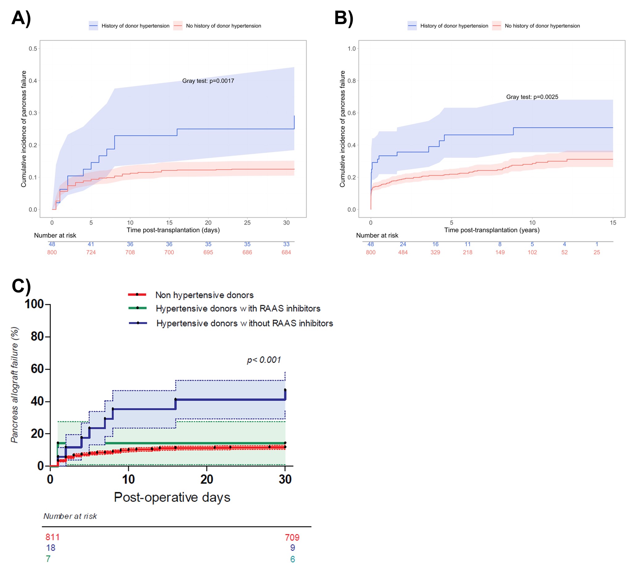 Results. Pancreas from donors with history of hypertension (6.7%), as well as with high body mass index, were independently associated with an increased risk of pancreas failure within the first 30 post-operative days (respectively, HR= 2.57, 95% CI from 1.35 to 4.89 and HR= 1.11, 95% CI from 1.04 to 1.19). Interaction term between hypertension and BMI was negative. Donor hypertension also impacted long-term pancreas survival (HR= 1.88, 95% CI from 1.13 to 3.12). However, pancreas survival was no more impacted when calculated on post-operative day 31 and longer (HR= 1.22, 95% CI from 0.47 to 3.15). A significantly lower pancreas survival was observed in patients receiving a pancreas from a hypertensive donor without ACEi/ARB treatment compared to ACEi/ARB treatment. (50% vs 14%, p < 0.001). Pancreas survival was identical among non hypertensive donors and hypertensive ones under ACEi/ARB.