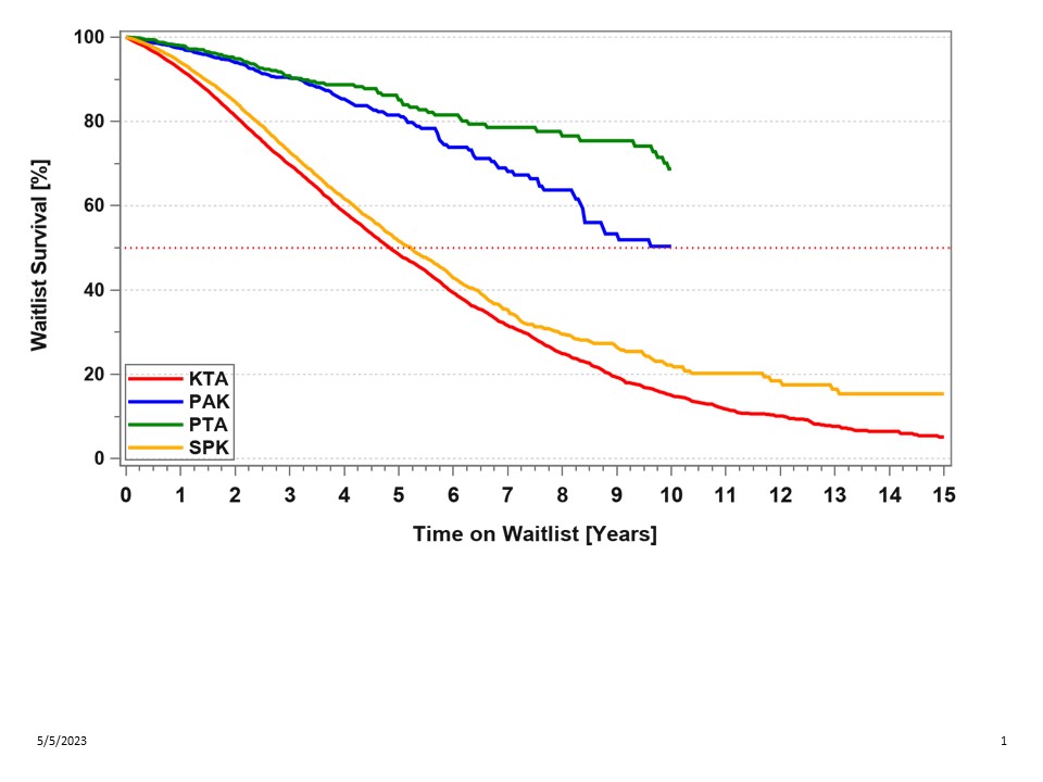 Methods: In this analysis, we reviewed 40,731 adult type 1 diabetic patients listed for primary pancreas and/or kidney transplant (16,035 Kidney Transplant Alone [KTA], 3,286 Pancreas after Kidney Transplant [PAK], 2,188 Pancreas Transplant Alone [PTA], 19,222 Simultaneous Pancreas and Kidney Transplant [SPK]). Of these, 25,043 patients underwent a deceased donor transplant, and 14,314 patients did not undergo a transplant and were still on the waiting list. Since most living donor transplants were in the KTA group, those transplants were separately analyzed.
