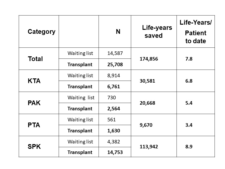 Conclusions: Our analysis demonstrates the following: (1) Waiting list mortality was highest for patients with end-stage-renal disease (KTA, SPK). Patient survival was highest after SPK, PTA; the lowest patient survival rate was noted in DD KTA; (3) At 5-years, patient mortality rates from time of listing for transplanted vs. waiting patients was 87% vs 30% for DD KTA and 92% and 22% for SPK recipients (4) More average life-years were saved with SPK than with DD KTA; (5) To date, primary DD pancreas and/or kidney transplants in type 1 diabetics have saved almost 300,000 life-years.