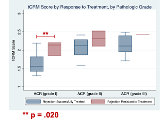 Results: Significant differences in gene expression were seen in G2 and G3 ACR, but not G1 ACR, when compared with normal pancreas samples. Pathway analyses demonstrated that the genes enriched in G2 and G3 ACR were associated with inflammatory pathways like interferon signalling, antigen processing and presentation, and phagocytosis. A statistically significant difference was found in the tCRM scores for G2 ACR and G3 ACR, when compared to the tCRM score for normal pancreas tissue. Patients with rejection that was resistant to treatment (defined as recurrent rejection within 2 months of the initial rejection episode) had significantly higher tCRM scores (Figure 1). This difference remained significant for patients with G1 ACR, but was not significant for patients with G2 or G3 ACR (Figure 2).