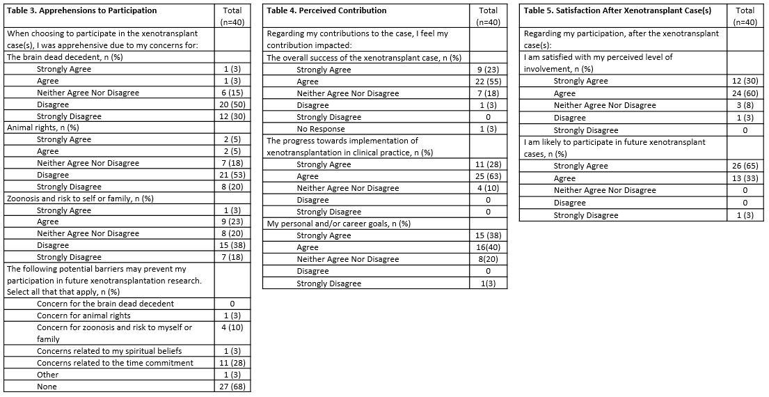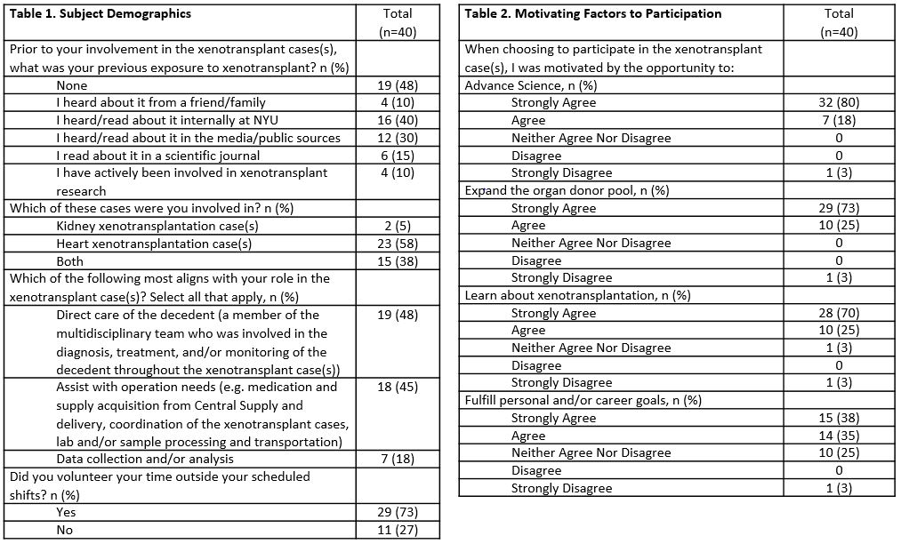 Results: 58 participants were eligible for participation. There were 42 (72%) respondents, but 2 were excluded for incomplete surveys; 40 were included for analysis. 48% of respondents had no previous exposure to the field of xenotransplantation prior to these cases, and 70% learned about it either internally or in the media/public sources. 58% were only involved in the heart cases and 38% were involved in both kidney and heart xenotransplant cases. 73% of respondents volunteered their time outside of scheduled shifts. The majority of respondents reported their motivations to participate were to advance science (98%), expand the organ donor pool (98%), learn about xenotransplantation (95%), and fulfill personal and/or career goals (73%). 26% of respondents had apprehensions to participate due to the potential risk of zoonosis, 18% had concerns related to time commitment, and 10% had apprehensions related to animal rights. The majority reported no barriers to participation in future xenotransplantation research (68%). With regard to respondents’ perceived contributions, 78% felt they impacted the overall success of the xenotransplant cases, 91% felt they impacted progress towards implementation of xenotransplantation in clinical practice, and 78% felt participation impacted their personal/career goals. 90% of respondents were satisfied with their level of involvement and 98% are likely to participate in future xenotransplant cases.