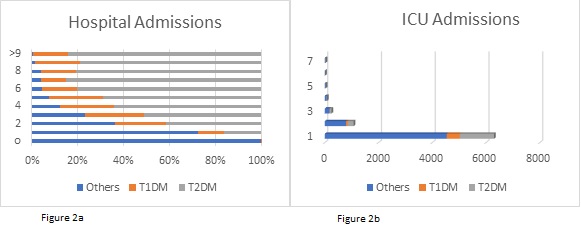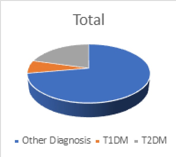Results: 7800 individual patients and all their hospital interactions between 01-01-2017 and 31-12-2022 were analysed. 559 (7.2%) of these patients had T1DM and 1609 (20.6%) had T2DM. The remainder were non-diabetic (Figure 1).