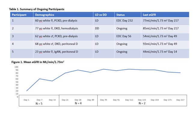 Results: The study is ongoing. As of the abstract submission deadline, May 2023, 5 participants have been transplanted, and 3 are ongoing. No participant has experienced rejection. One discontinued due to an SAE of BK viremia and another for mild alopecia and fatigue. BK viremia was the only SAE reported to date, and the drug appears safe and well tolerated. Participant information is summarized in Table 1, and mean eGFR is summarized in Figure 1.