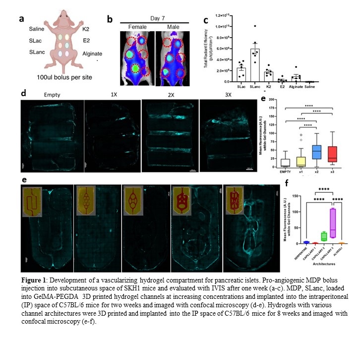 Type 1 Diabetes (T1D) is a chronic, autoimmune disease of the pancreas. In T1D, insulin-producing cells, known as islet beta cells, are destroyed by the host immune system causing lifelong regulation of patient glucose levels. Islet replacement therapy is a promising treatment for T1D. However, transplanted islets are targeted by the host immune system, have poor cell survival and retrieval, and require lifelong immunosuppression. Alternatively, islets can be encapsulated in macro devices composed of biomaterials that evade the immune system and allow local implantation and retrieval. Islet survival remains a key challenge in macro devices due to poor nutrient diffusion. 3D-printed gelatin methacrylate (GelMa) and polyethylene glycol diacrylate (PEGDA) hydrogels can be fabricated with open channels to encourage vascular ingrowth into 3D constructs. Multidomain peptide (MDP) VEGF-mimic hydrogels have been shown to improve angiogenesis in vivo and can be utilized as a pro-angiogenic agent within hydrogel channels. We hypothesized that an open-channel hydrogel with MDP will promote vascularization to nearby encapsulated islets and long-term islet survival. In vivo fluorescence imaging was performed to evaluate various pro-angiogenic peptide injections in subcutaneous space of SKH1 mice to determine the lead. We selected SLanc as it exhibited the best proangiogenic potential in vivo (Fig. 1 a-c). A 10wt% GelMA and 3.25wt% 3.4 kDa PEGDA hydrogel was printed with a LumenX stereolithography printer. MDP was loaded into hydrogel channels at various concentrations prior to implantation. MDP loaded hydrogels were implanted into the fat pads of 6-10 week old C57BL/6 male mice. Mice were intravenously injected with fluorescent dextran and explanted after 2 weeks. Samples were evaluated with confocal microscopy. We found that MDP-loaded hydrogels demonstrated vascular formation after 2 weeks of fat pad implantation in-vivo with MDP concentrations above 2X (Fig. 1d-e). Secondly, the hydrogels were 3D printed to possess different channel architectures and implanted as described above. After 8 weeks, hydrogels were retrieved and analyzed. We found that larger, more open architectures encourage host vessel infiltration (Fig. 1f-g). Our work demonstrates promising formulations and hydrogel structures for establishing vascularization within an implantable construct for T1D therapeutic applications. The pro-angiogenic peptide formulation demonstrates that vascularization can be achieved through a peptide formulation and without immunosuppressants. MDP formulations will be further assessed with the addition of an encapsulated islet compartment that is surrounded by our vascularizing 3D-printed hydrogel with the most pro-angiogenic architecture to promote nutrient delivery to islets. Islet functionality and glycemic correction will be measured to confirm the significance of the vascular hydrogel compartment and our vascular formulations.