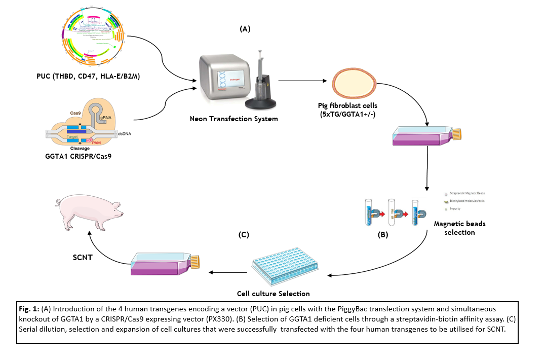 Study B: A vector encoding the four human transgenes Thrombomodulin (hTHBD), CD47 and the protein complex B2M/HLA-E was introduced into genetically edited pig fibroblasts, that are heterozygous for GGTA1 and express five proteins that avoid complement system activation, using a PiggyBac-mediated transfection approach. Additionally, a vector targeting GGTA1 for knock-out was simultaneously introduced. To select cells that are negative for GGTA1, a streptaividin-biotin affinity assay was utilized. These cells were serially diluted to select cell colonies that are positive for the transfected transgenes to evaluate them for SCNT.