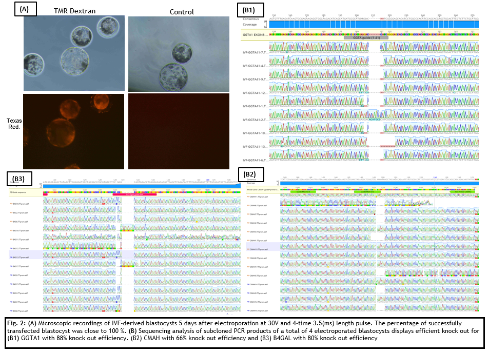 Study A: The fluorescent compound TMR-Dextran was first introduced into parthogenetically activated pig zygotes to test and establish optimal parameters for the electroporation procedure. The resulting protocol was then implemented for the electroporation of GGTA1,CMAH and B4GAL crRNAs/Cas9 complexes into IVF embryos. Dextran electroporation into IVF embryos was also performed as a positive control.