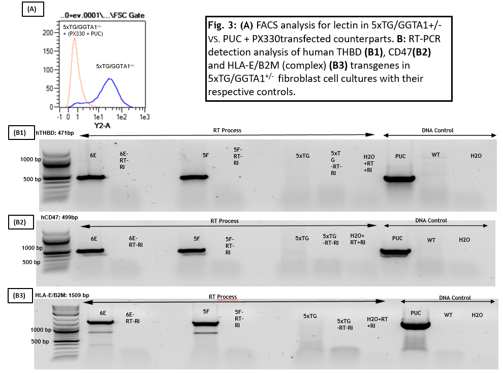 Double knockout of GGTA1 and genome insertion of hTHBD, hCD47 and B2M/HLA-E protein complex in (5xTG/GGTA1+/-) pig fibroblast cells was successfully achieved . mRNA expression was also analyzed for the different fibroblast cell cultures, demonstrating effective efficiency of this approach.