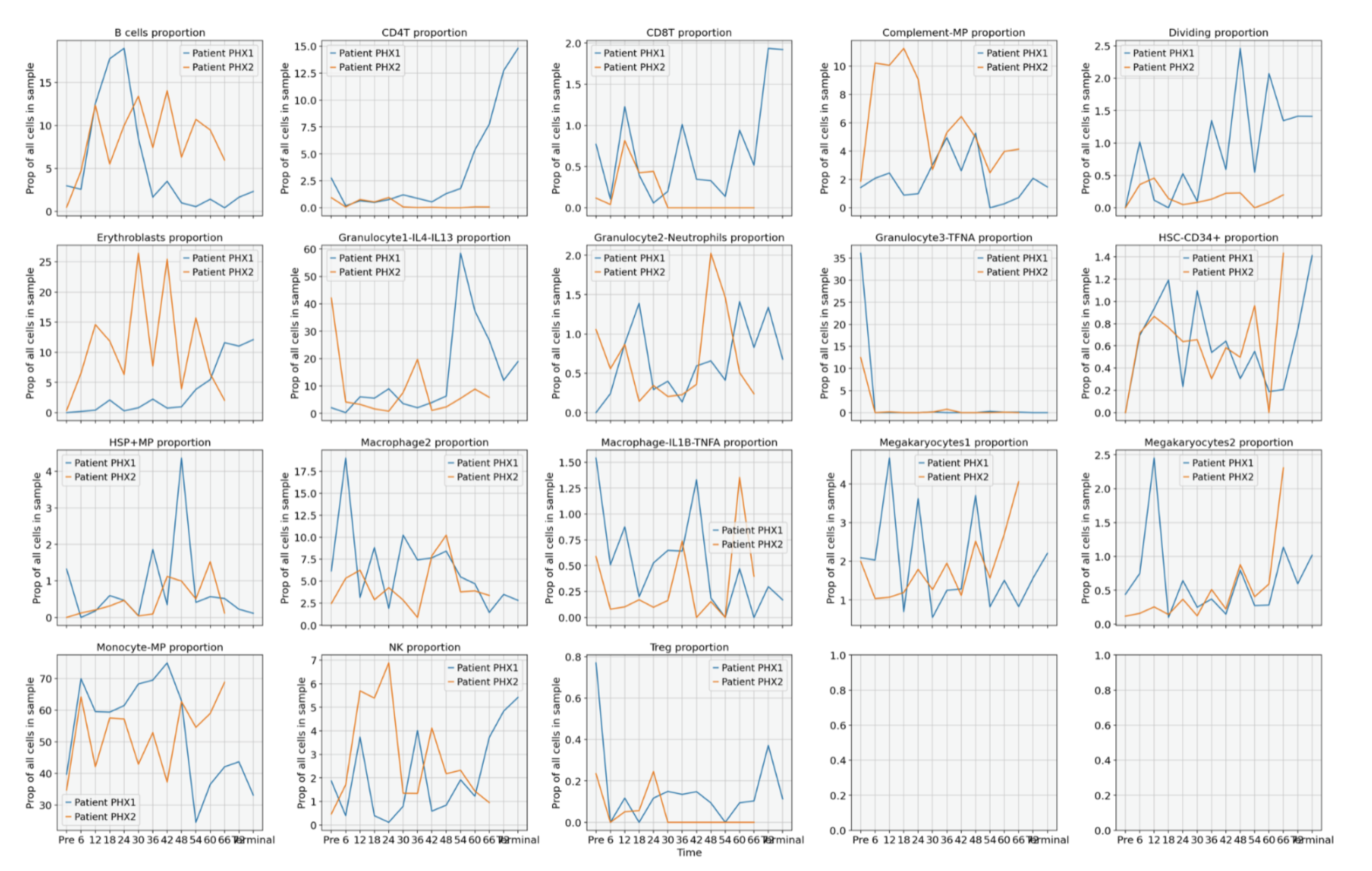Results: Multi-omic profiling of blood from two pig heart to human xenotransplants shows significant changes increases in metabolic and antigen presentation pathways after the 40 hours timepoints in the first xenoheart decedent (PHX1 in Figure 1). This timeframe coincides with significant physiological changes including major increases in liver transaminase enzyme activity. Significant proteomic and metabolomic pathway changes were observed including Glycolysis/Gluconeogenesis metabolism (p< 5 x 10-20), Pyruvate metabolism (p < 7 x 10-11) and antigen processing and presentation (p = 5.6 x 10-5). Utilizing PBMC scRNAseq across the same time points, we identify key changes in immune cell types and subtypes, including T-cell subtypes, B cells, granulocytes, macrophages, and monocytes. Notably we see a particularly sharp increase in CD4 T-cells, followed by CD8 T-cells with these changes preceded by a marked increase in B cells, whose timepoint-associated phenotypes exhibit IL1B- & IL17-related activation at 6 and 12 hours, followed by B-cell proliferation and BCR activation at 18 and 24 hours.