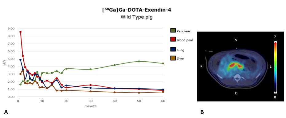 Introduction: Transplantation of pancreatic islets into the liver is a curative therapy for patients with poorly controlled type 1 diabetes. So far, there is no common non-invasive method for longitudinal monitoring of the transplanted viable islet cell mass. Exendin-4 as a specific ligand of the glucagon-like peptide 1 receptor (GLP1R), which is localized at high levels on beta cells, might be useful as radionuclide tracer to monitor the viable beta-cell graft mass in the liver by PET/CT in vivo.