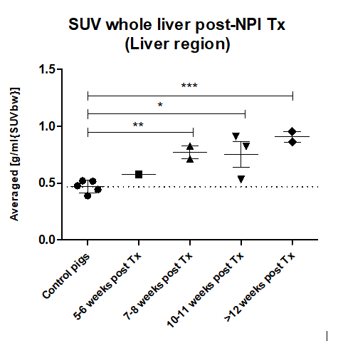 Results: The proof-of-concept [68Ga]Ga -DOTA-Exendin-4 PET/CT imaging study showed a specific signal in pig pancreas (Figure 1), that was significantly reduced in a blocking study with cold Exendin-4. In livers of NPI recipient pigs which reached a normoglycemic status (<130 mg/dl Glc, 3 of 4 pigs), the standard uptake value (SUV) of the liver significantly increased compared to the control values (61% at 7-8 weeks and 94% after 12 weeks; Figure 2). The increased liver signal was multifocal with clusters of individual hotspots, matching the histological distribution pattern of islet in the liver, which contained mainly insulin positive beta cells. No signs of immune rejection were observed in the graft recipient animals reaching normoglycemia.