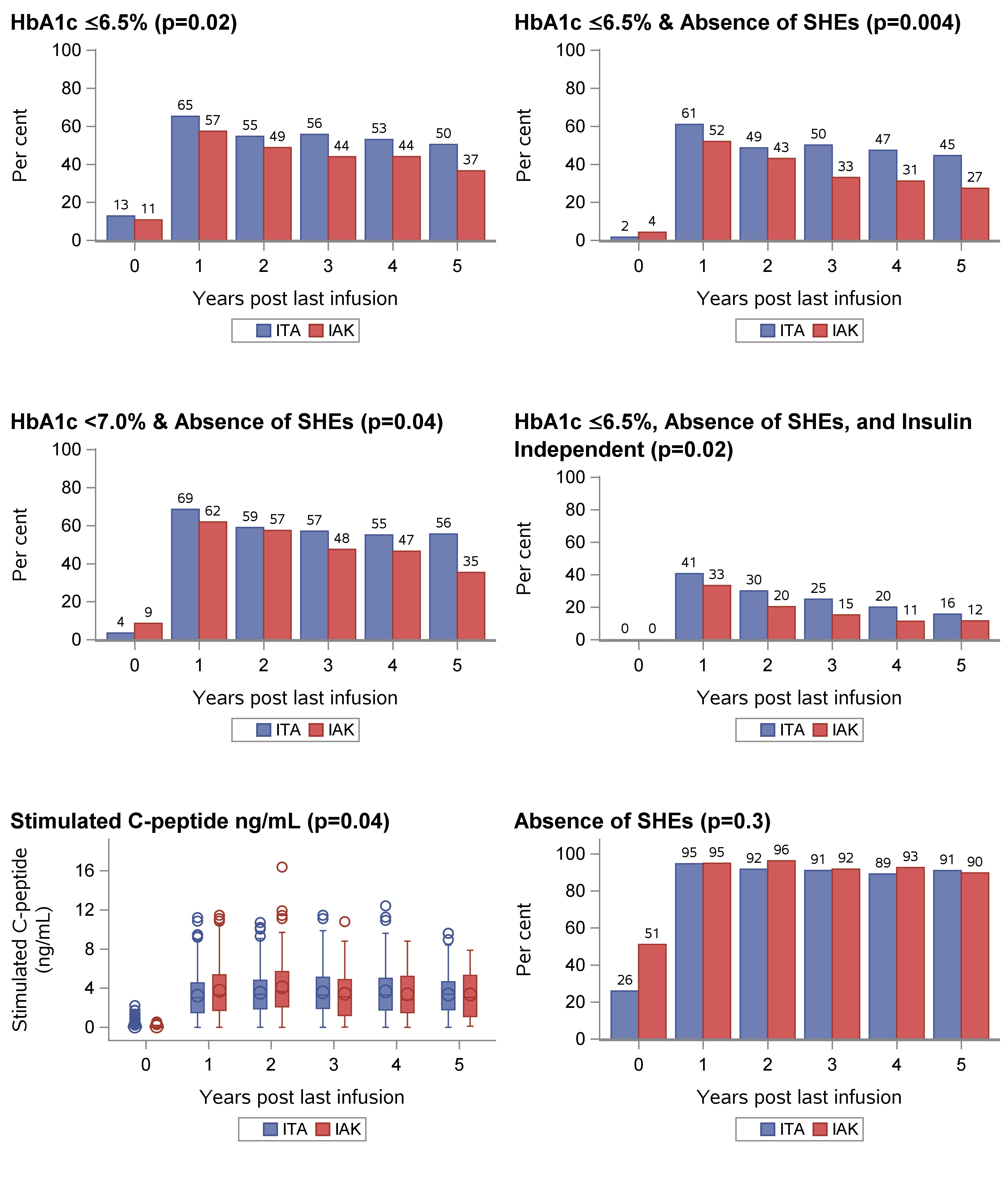 Conclusion: In these unadjusted analyses of glycemic outcomes, ITA recipients displayed better metabolic control defined by the combination of HbA1c, insulin independence and ASHE, compared to IAK. The higher stimulated C-peptide noted in the IAK recipients could be attributed to lower insulin sensitivity and/or lower eGFR, but this was not formally evaluated. Further analyses aimed at identifying factors predictive of optimal outcomes in each of these cohorts are required.