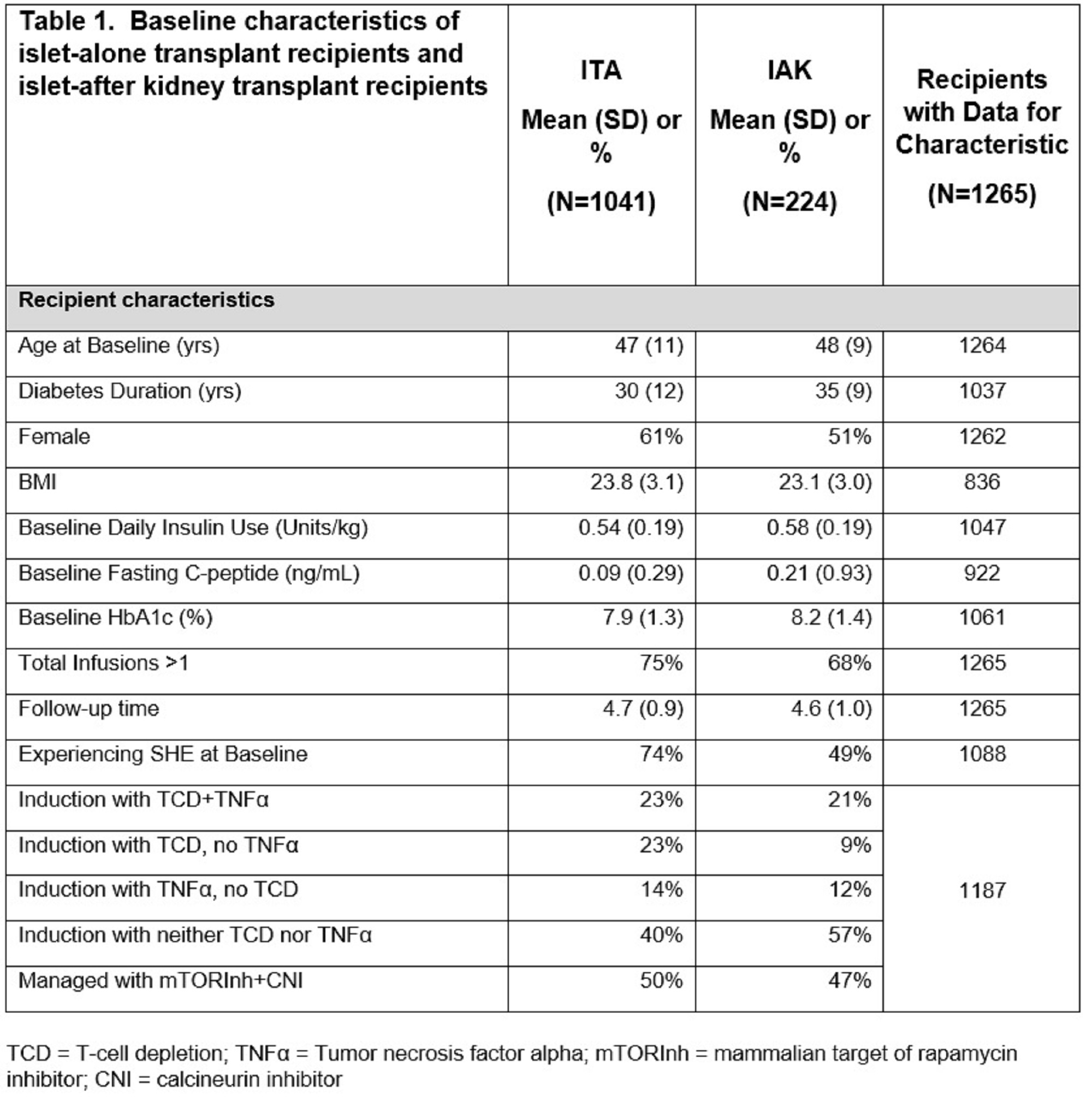 Methods: ITA (N=1041) and IAK (N=224) recipients registered in CITR with at least 1-year of follow-up reported as of February 15th, 2022, were analyzed. Mixed effects models were used to assess the univariate association of transplant type with outcomes including fasting glucose, HbA1c, severe hypoglycemic events (SHEs), insulin use, and C-peptide over 5 years following the last islet infusion. Immunosuppression strategy was dependent on the clinical protocol at each participating CITR site. Notably, a larger percentage of ITA participants underwent T-cell depletion (46 vs. 30%). Baseline characteristics for both study cohorts are shown in Table-1. Time in waiting list did not differ significantly between cohorts.