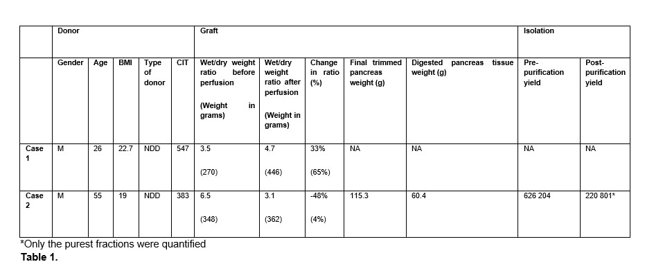Methods: Two discarded human pancreas grafts were received by our team for perfusion. Backtable preparation was done in the usual manner with the additional cannulation of the aorta and portal vein, as well as the placement of a Malecot catheter on the distal side of the duodenum. Grafts were then placed on the machine and perfused for 4 hours on a NEVP circuit, previously developed, and described by our group. After the perfusion, biopsies were taken for H&E and insulin staining, and the organs were immediately processed for islet isolation using the Edmonton Isolation Protocol.